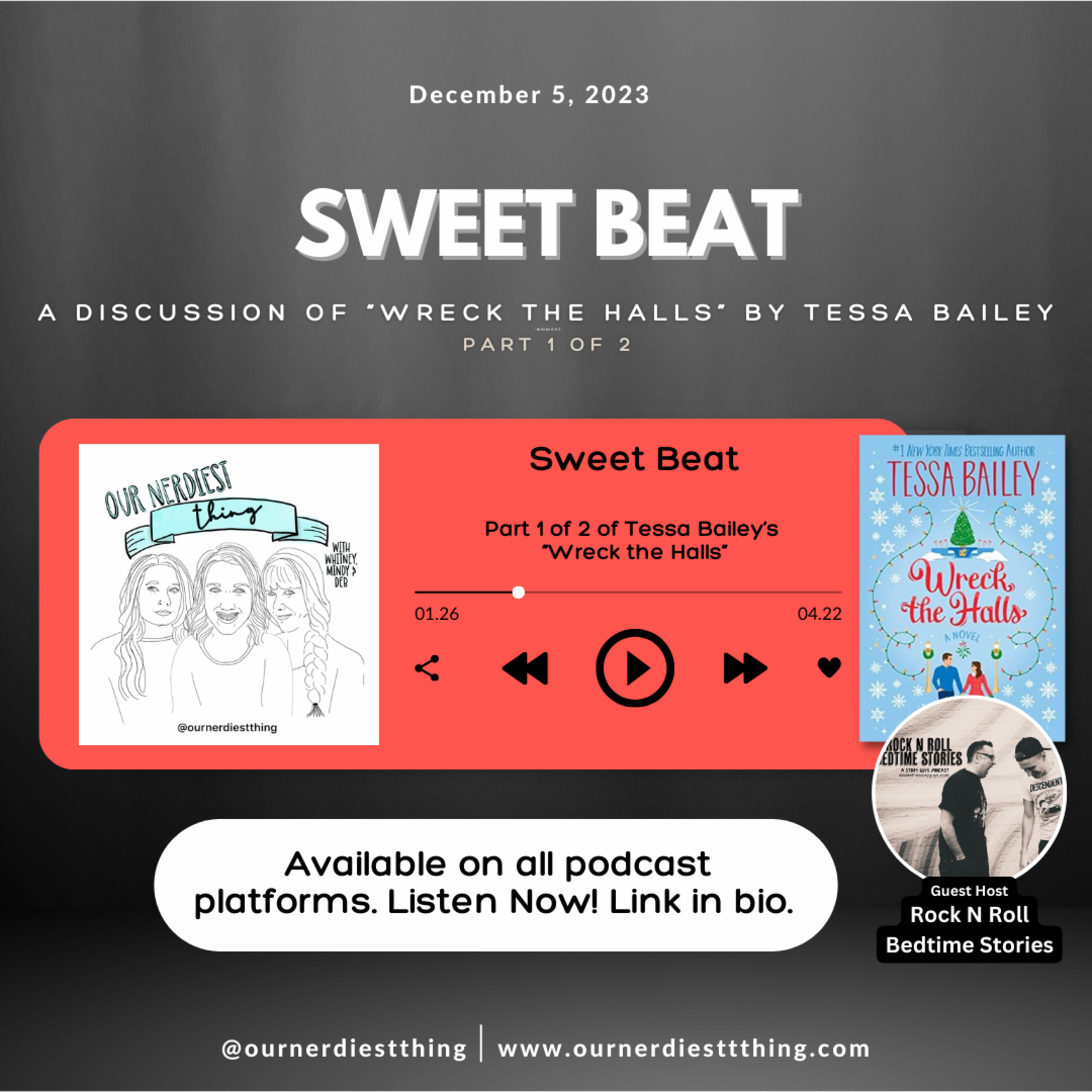 Hello, fellow nerds! We're back for our December read-a-long, discussing chapters 1-16 of @tessabaileyisanauthor new book, "Wreck the Halls"! This week, we have a special guest host, Brian, from the @rocknrollbedtimestories podcast and he’ll be discussing the top three most ridiculous band breakups of all time. Then, we’ll chat more about Fleetwood Mac and how nostalgia can be bad for your mental health.
