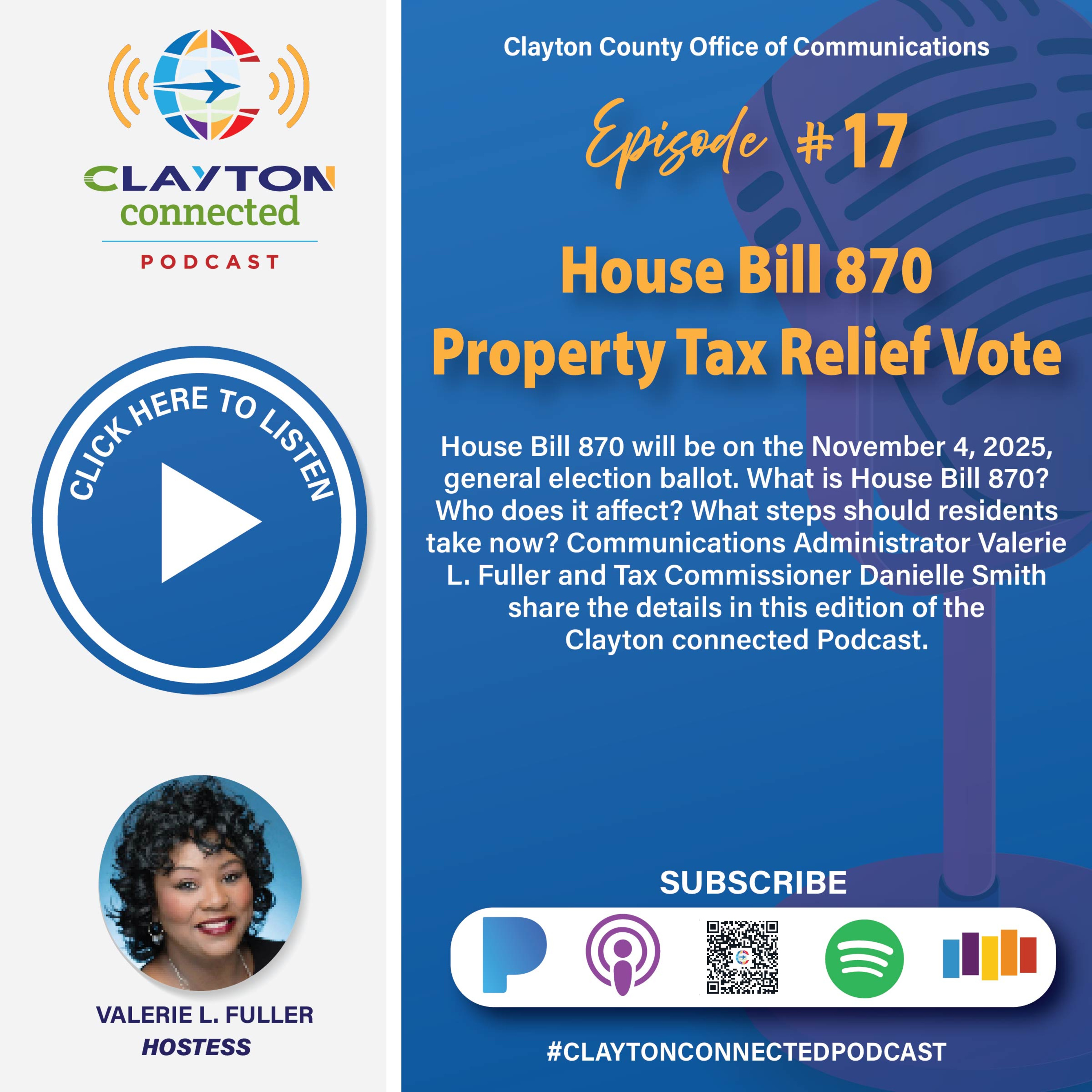 House Bill 870 will be on the November 4, 2025, election ballot. What is HB 870, who does it affect and what steps should residents take now? Communications Administrator Valerie L. Fuller and Tax Commissioner Danielle Smith share the details in this edition of the Clayton connected Podcast.