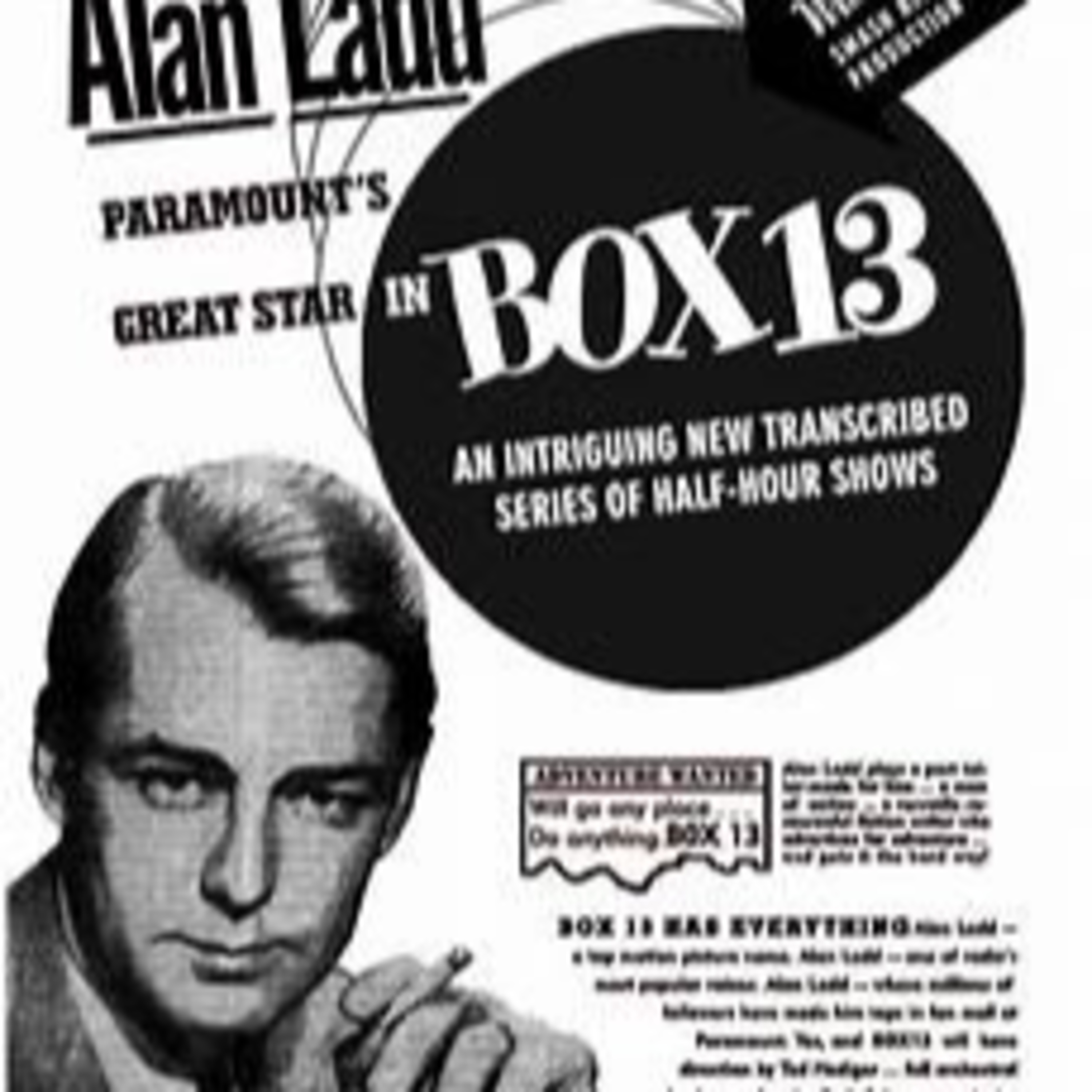 Box 13 is a syndicated radio drama about the escapades of newspaperman-turned-mystery novelist Dan Holiday, played by film star Alan Ladd. Created by Ladd's company, Mayfair Productions, Box 13 aired in different cities over different dates and times. It first aired in several United States radio markets in October 1947. Episode 16.