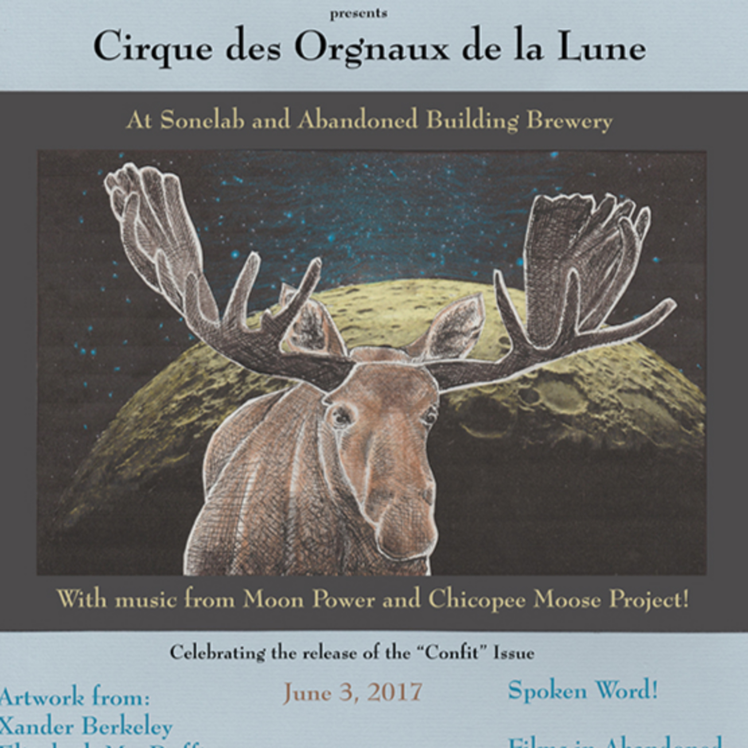 The eighth episode of the Meat For Teacast. Featuring recordings from the June 3, 2017 Cirque des Orignaux de la Lune, recorded live at Sonelab. Featuring spoken word from Jane Yolen, Jacob Chapman and Richard Wayne Horton, and live music from Moon Power.