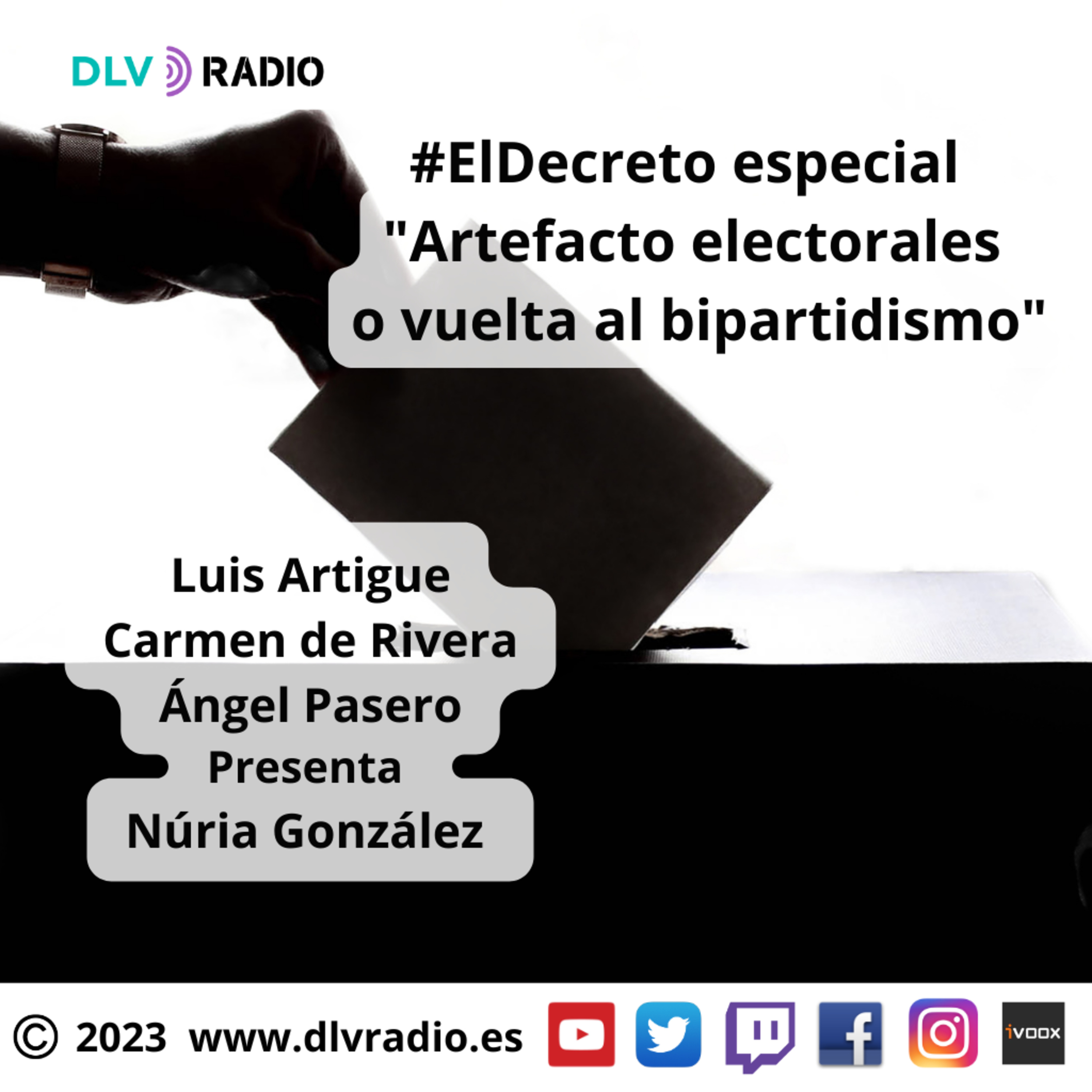 Comenzamos de nuevo con las elecciones, en esta ocasión con las generales, al Congreso de los Diputados y al Senado. Como estamos viendo van a ser unas elecciones calentitas. Está el movimiento de la izquierda de SUMAR o restar porque en sus planes parece que no cogen todos, ejemplo los vetos a PODEMOS. La derecha que también va separada, aunque luego se junten a posteriori según sus intereses. De esto y más puntos hablaremos esta noche en la tertulia dé ElDecreto. Esta noche nos acompañan: Ángel Pasero - Periodista, Luis Artigue - Escritor y Carmen de Rivera - Abogada. Moderará como siempre Núria González.