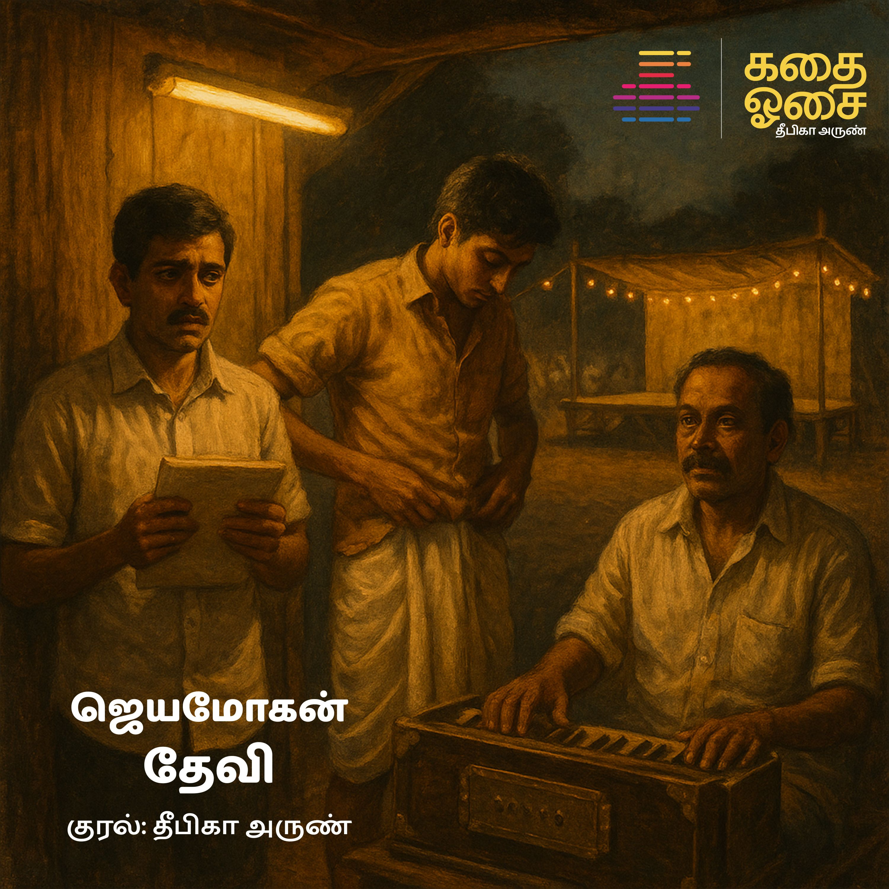 பழைய ஆர்மோனியக் கட்டைகள், தபேலாத் துள்ளல், ஊர்க்கூட்டத்தின் கைதட்டல், ஒரு பெண்ணின் மூன்று வித்தியாசக் குரல்கள் – எல்லாம் சேர்ந்து கண்ணால் பார்க்காமலேயே மனதில் மேடையை உருப்பெற வைக்கும் கதை - தேவி. கேளுங்கள் கதை ஓசையில் மட்டுமே!