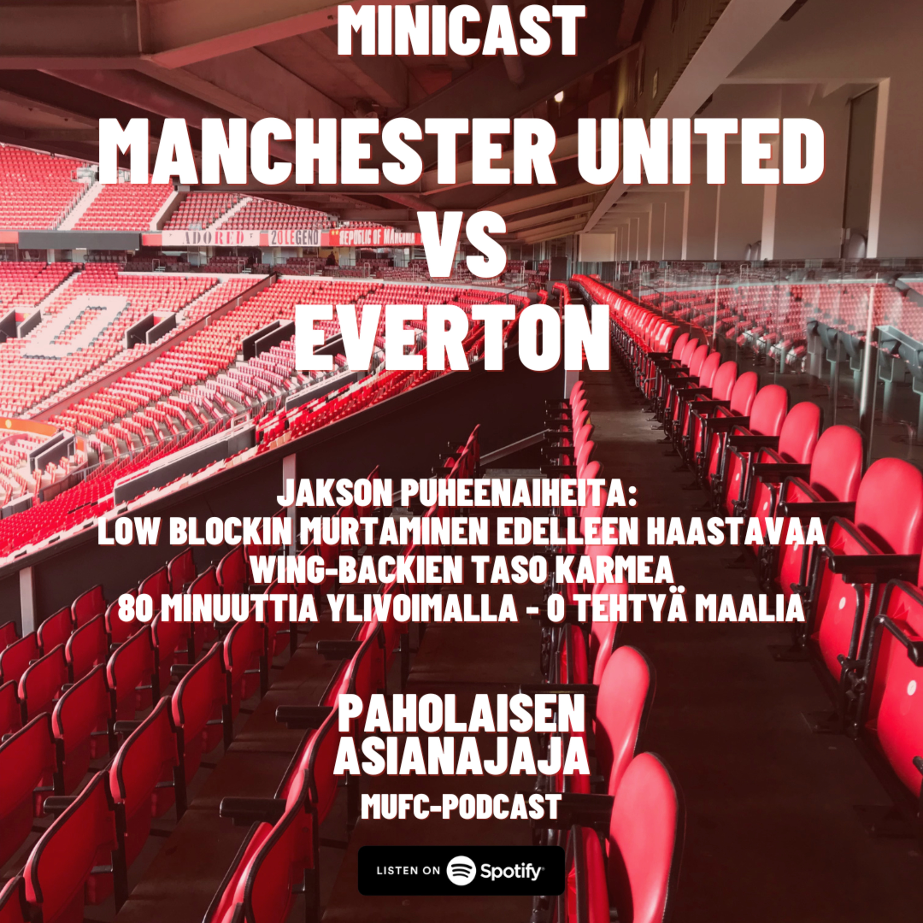 Tässä jaksossa pureudutaan Everton-otteluun. Ei auttanut yöunet edes purkamaan tuskaa tämän ottelun jälkeen. Vähän onnistujia, vähän hyviä maalipaikkoja. Sitä oli tämä ottelu Old Traffordilla.
