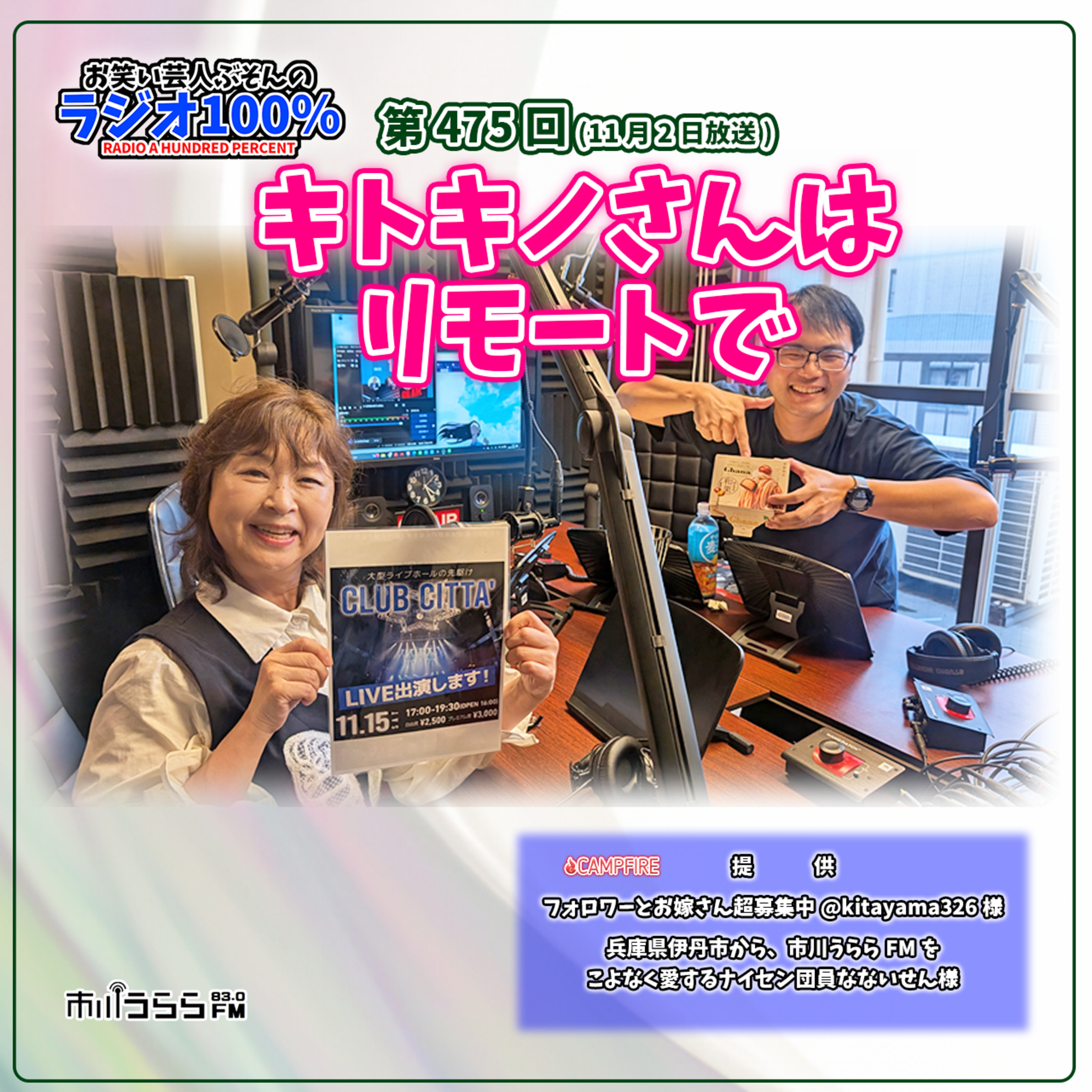 【2025年11月2日放送】第1週はぶそんとNizikaさん、キトキノ3cmのキョリさん。主催ライブの話とミスチル「くるみ」11月のリクエスト曲テーマは『食欲増進ソング』市川うららFM 毎週日曜日23:00~23:30『お笑い芸人ぶそんのラジオ100%』http://buson100.jimdo.com/この番組は、お笑い芸人「がんばれ!ぶそんくん」と個性豊かな週替わりMCがお送りする新感覚音楽バラエティー。第1週アーティストNzika、キトキノ3cmのキョリ、第2週カワイイもの大好きタレント姫香、第3週水族館と鉱物大好き今野青、第4週歌うピアノ講師茶々。、シンガー陽葵が独自の企画をぶつける。キャンプファイヤーでの提供・フォロワーとお嫁さん超募集中@kitayama326 様・兵庫県伊丹市から、市川うららFMをこよなく愛するナイセン団員なないせん 様提供は↓からhttps://community.camp-fire.jp/projects/view/278655