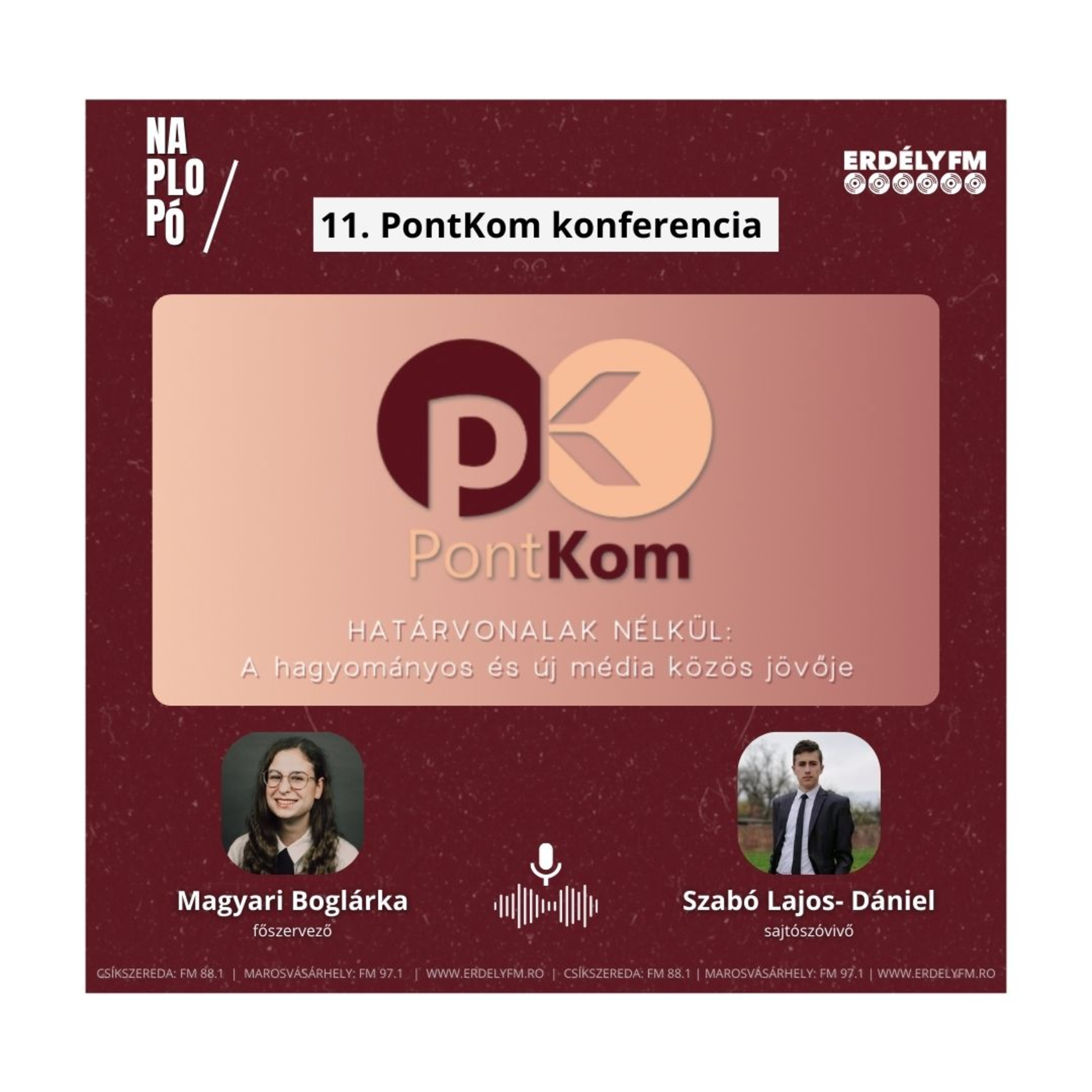 November 15.-én 11. alkalommal szervezik meg a PontKom konferenciát a Sapientia Erdélyi Magyar Tudományegyetem Marosvásárhelyi karának kommunikáció és közkapcsolatok szakos végzős hallgatói. Az esemény kapcsán Magyari Boglárka főszervezővel és Szabó Lajos Dániel sajtószóvivővel beszélgettünk a Naplopóban.