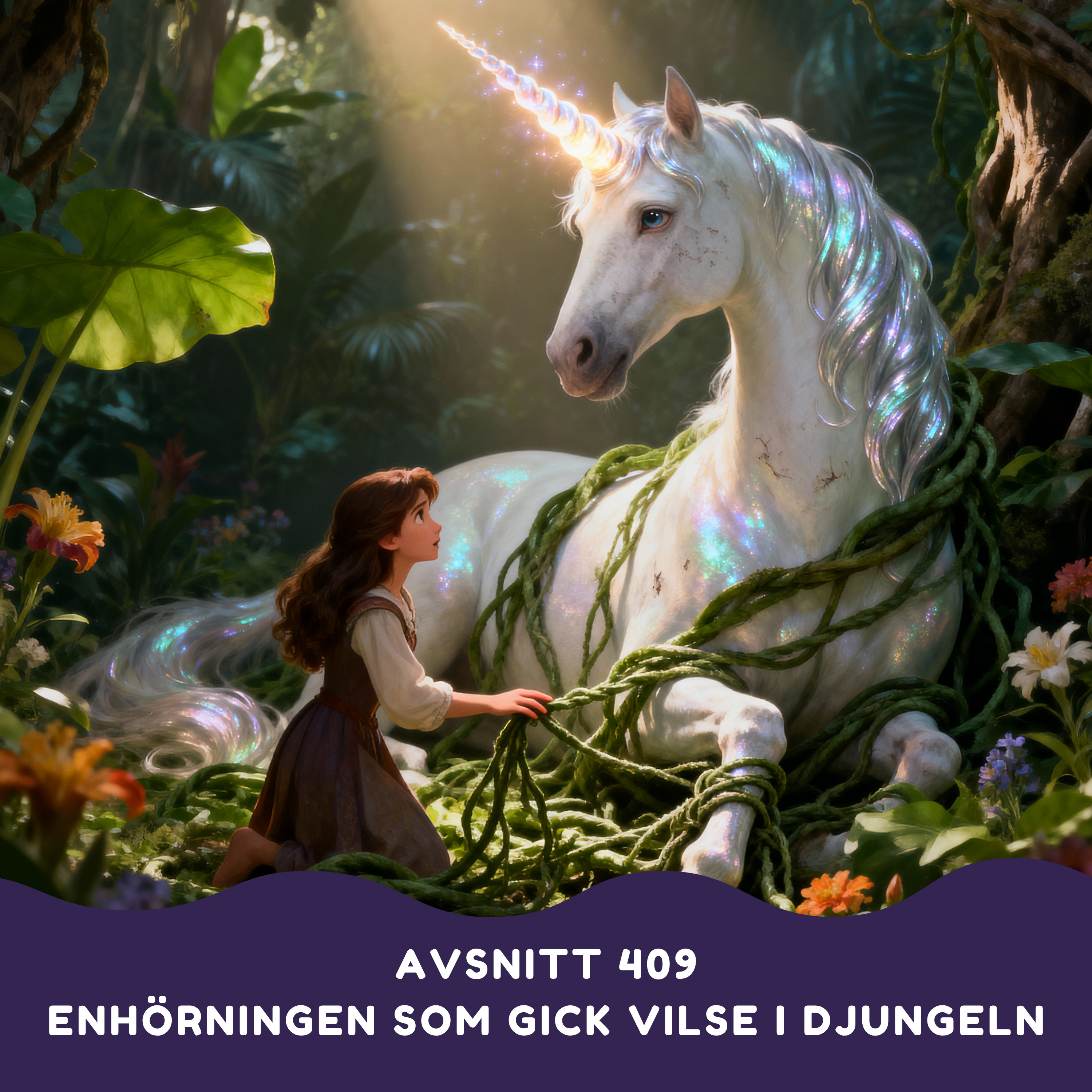 I dagens avsnitt får vi höra den mystiska och färgsprakande sagan "Enhörningen som gick vilse i djungeln", önskad av Monday, 6 år från Koh Phangan i Thailand.