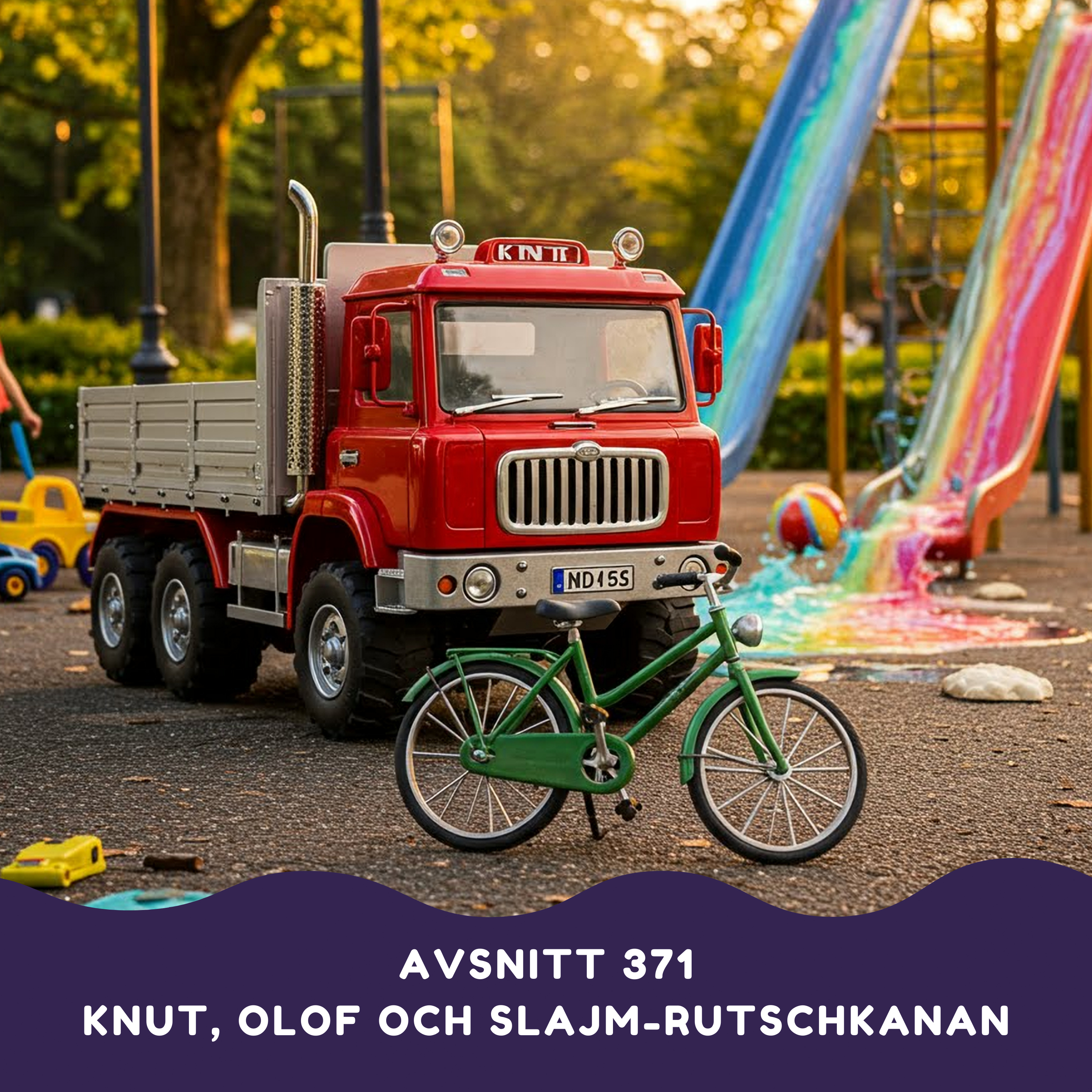 Följ med när den starka lastbilen Knut och den gamla skruttiga cykeln Olof blir oväntade vänner och bestämmer sig för att åka till parken tillsammans. Men väl där väntar en färgglad och kladdig överraskning - rutschkanorna börjar plötsligt spruta ut slajm! En hjärtevärmande berättelse om vänskap mellan två helt olika fordon och om att äventyr kan dyka upp när man minst anar det.