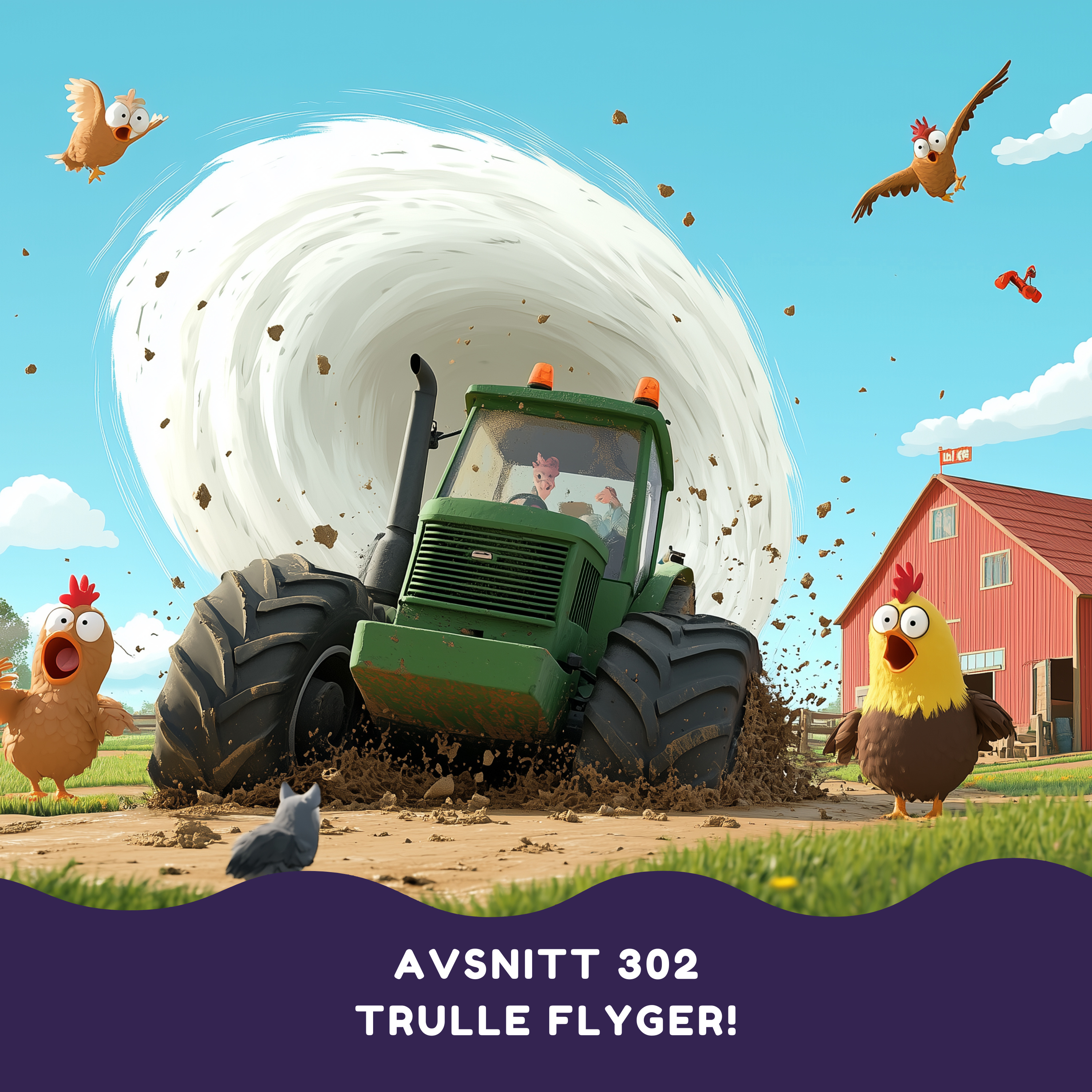Följ med på ett tokroligt äventyr där bonden Herr Nils och hans älskade traktor Trulle hamnar i knipa på åkern. När traktorn fastnar i ett lerigt surhål kommer hjälpen från ett oväntat håll - tre modiga hönor med en grävmaskin! Men när en virvelvind plötsligt dyker upp tar historien en helt oväntad vändning. En härlig berättelse fylld av samarbete, skratt och... flygande jordbruksmaskiner!