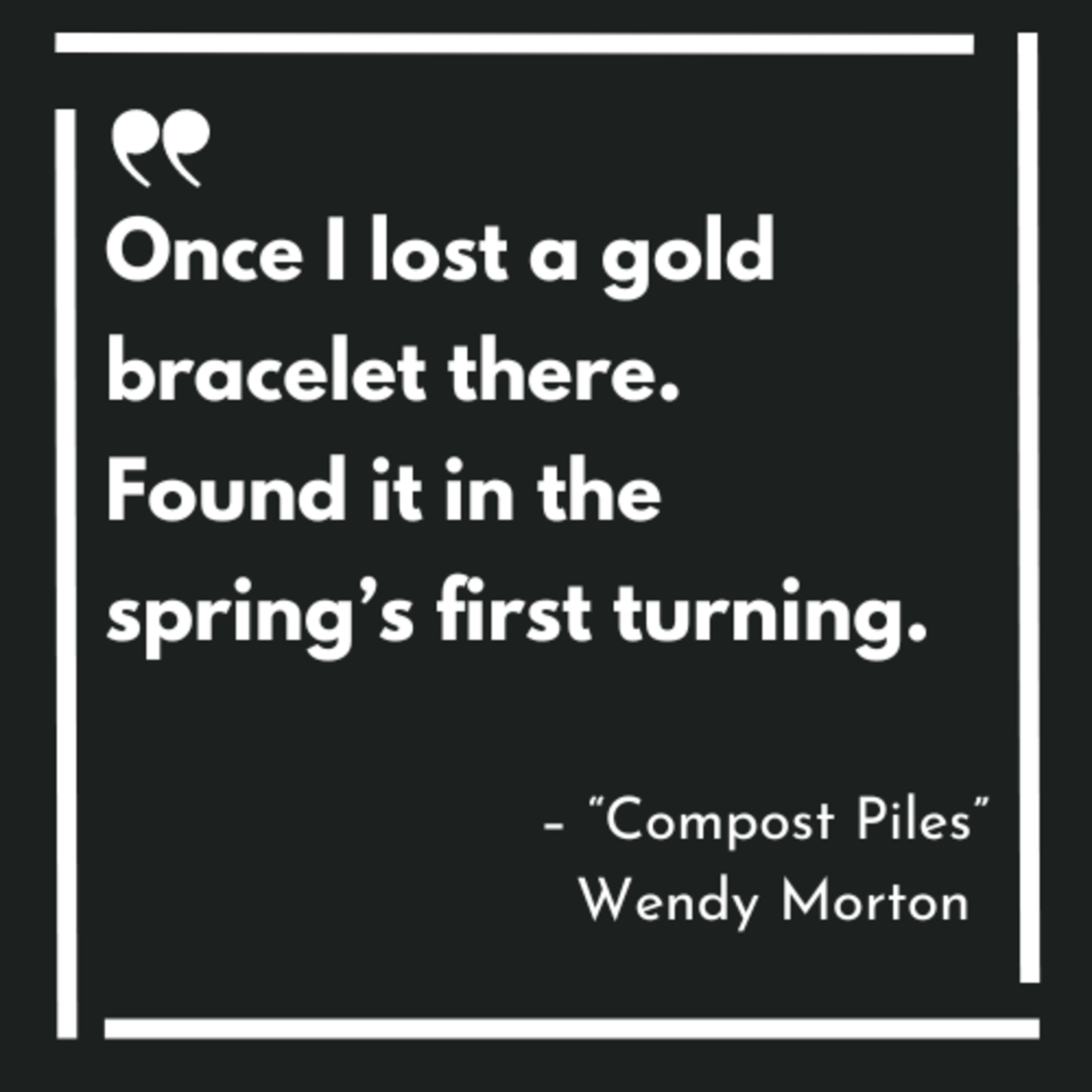 This poem, "Compost Piles", is a gorgeous little riff about a simple daily ritual, bringing the bucket to the compost pile, spread over the expanse of a year, and all the little recollections it prompts.