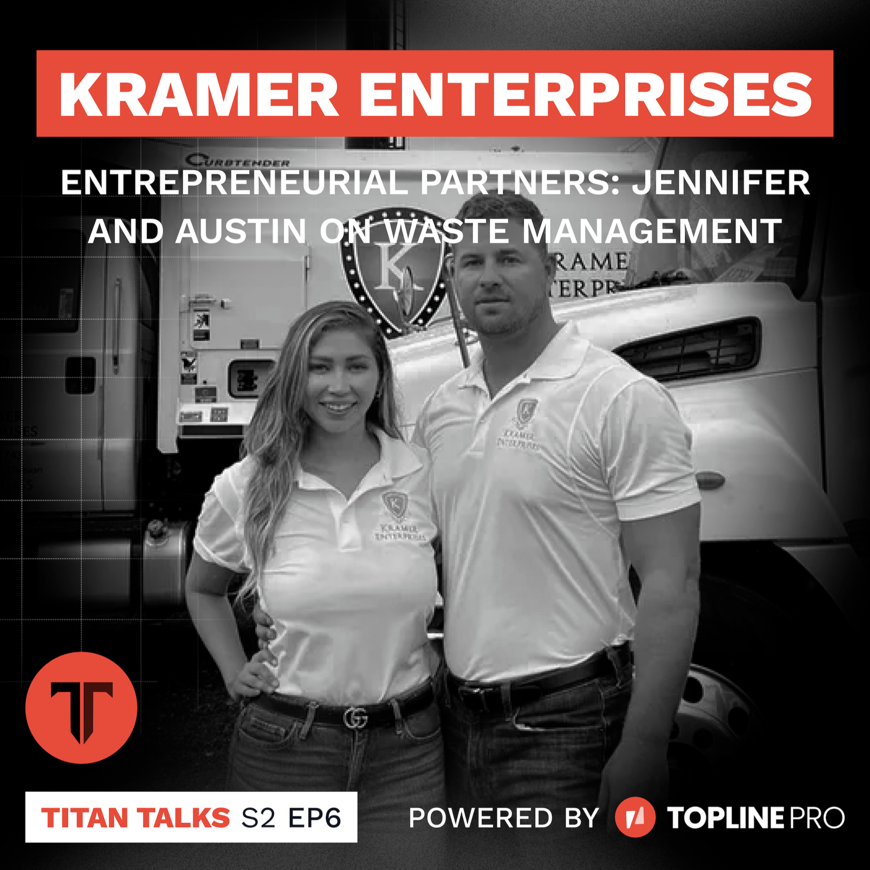In this episode of Titan Talks, Sam from Topline Pro speaks with Jennifer and Austin Kramer from Kramer Enterprises, a waste management company based in the DMV area. The couple details their journey from meeting in college to launching their own business inspired by Jennifer's father's demolition company. They discuss the challenges and growth they experienced, particularly expanding during the COVID-19 pandemic. The couple emphasizes the importance of communication and balance in managing both their personal and professional lives. They delve into their business strategies, including their relationship with Topline Pro, their social media marketing efforts, and their plans for future expansion. They also share insights on managing a growing team of 46 employees and navigating the complexities of running a business as a couple.