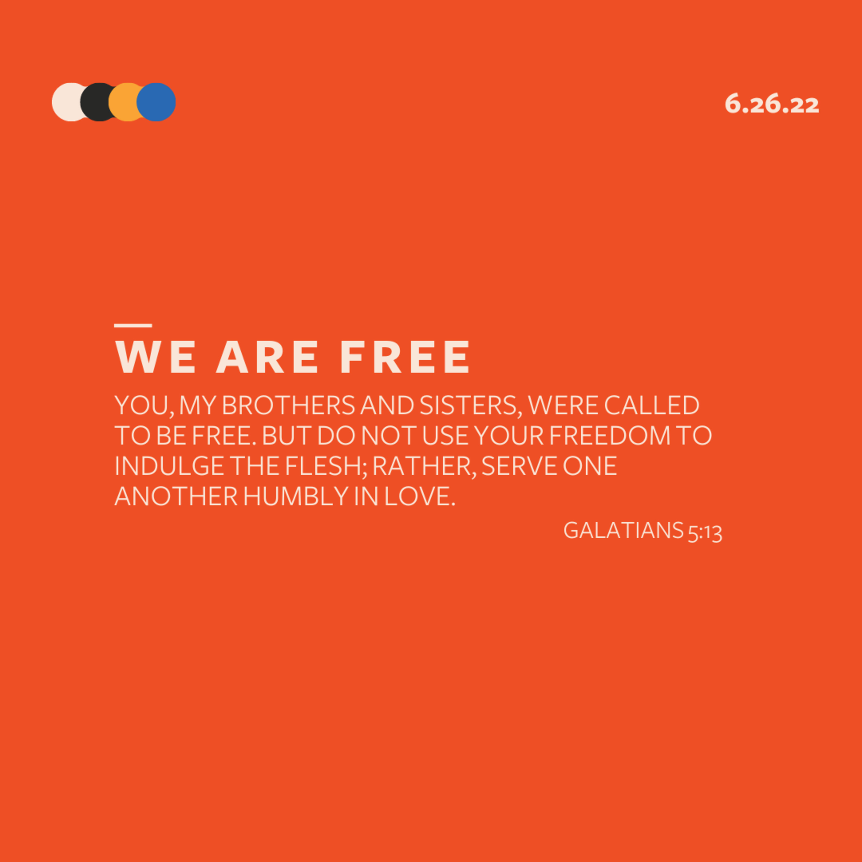 As we looked at the Apostle Paul’s letter to the Galatians in chapter 5 we read in verse 13, “You, my brothers and sisters, were called to be free. But do not use your freedom to indulge the flesh; rather, serve one another humbly in love.”