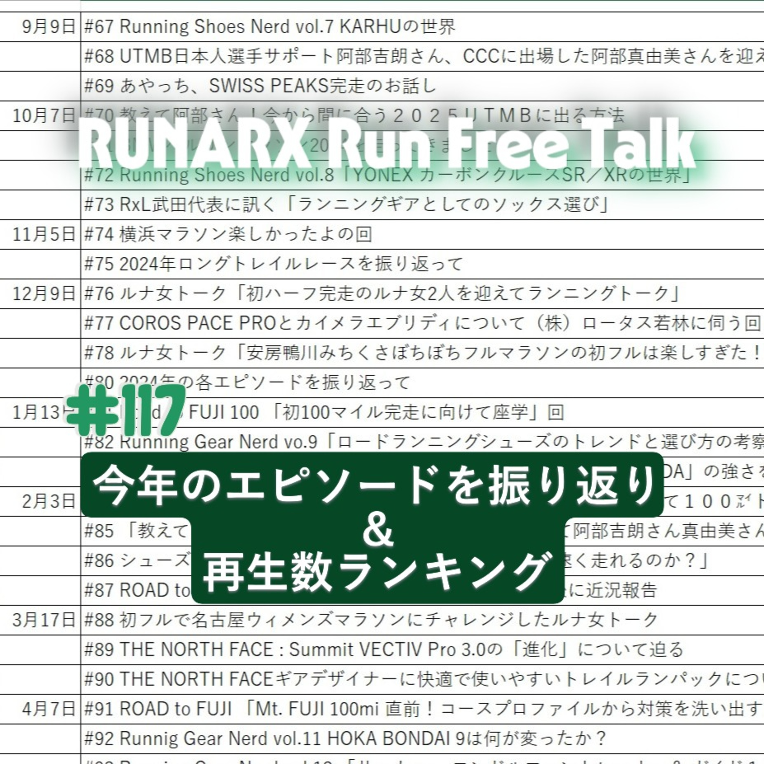 今年の配信回を振り返りつつ、2024年9月から2025年9月の1年間で配信したRUNARX Run Free Talkで何がよく聴かれたか?発表します。