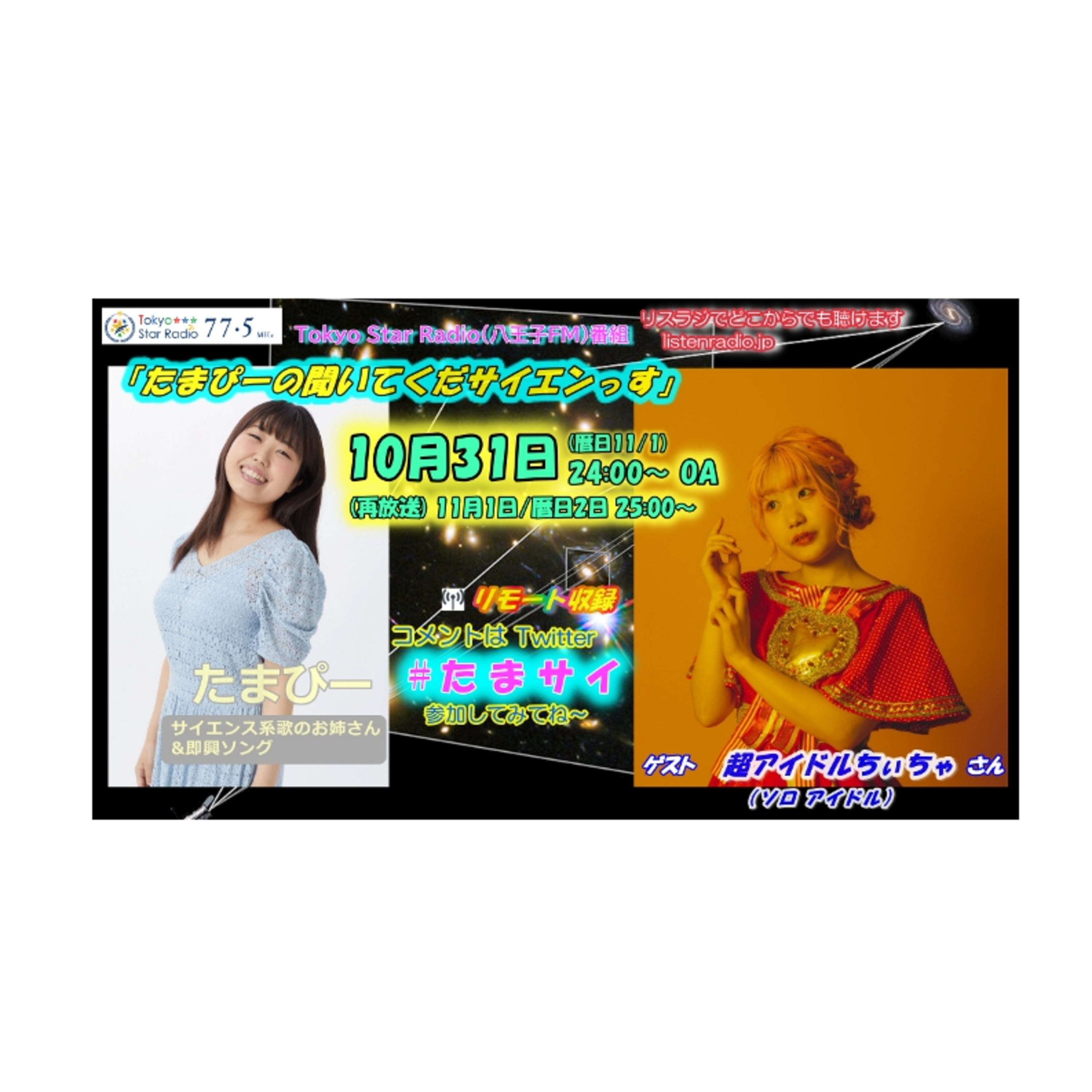 たまぴー(サイエンス系歌のお姉さん&即興ソング)&ゲスト 超アイドルちぃちゃ(不器用や失敗なども明るくなってしまうようなポップなステージが持ち味・大阪出身、関西と関東を中心にソロアイドルとしてライブ活動中!楽曲ジャンルは様々ですが、民謡の曲にも挑戦しています))