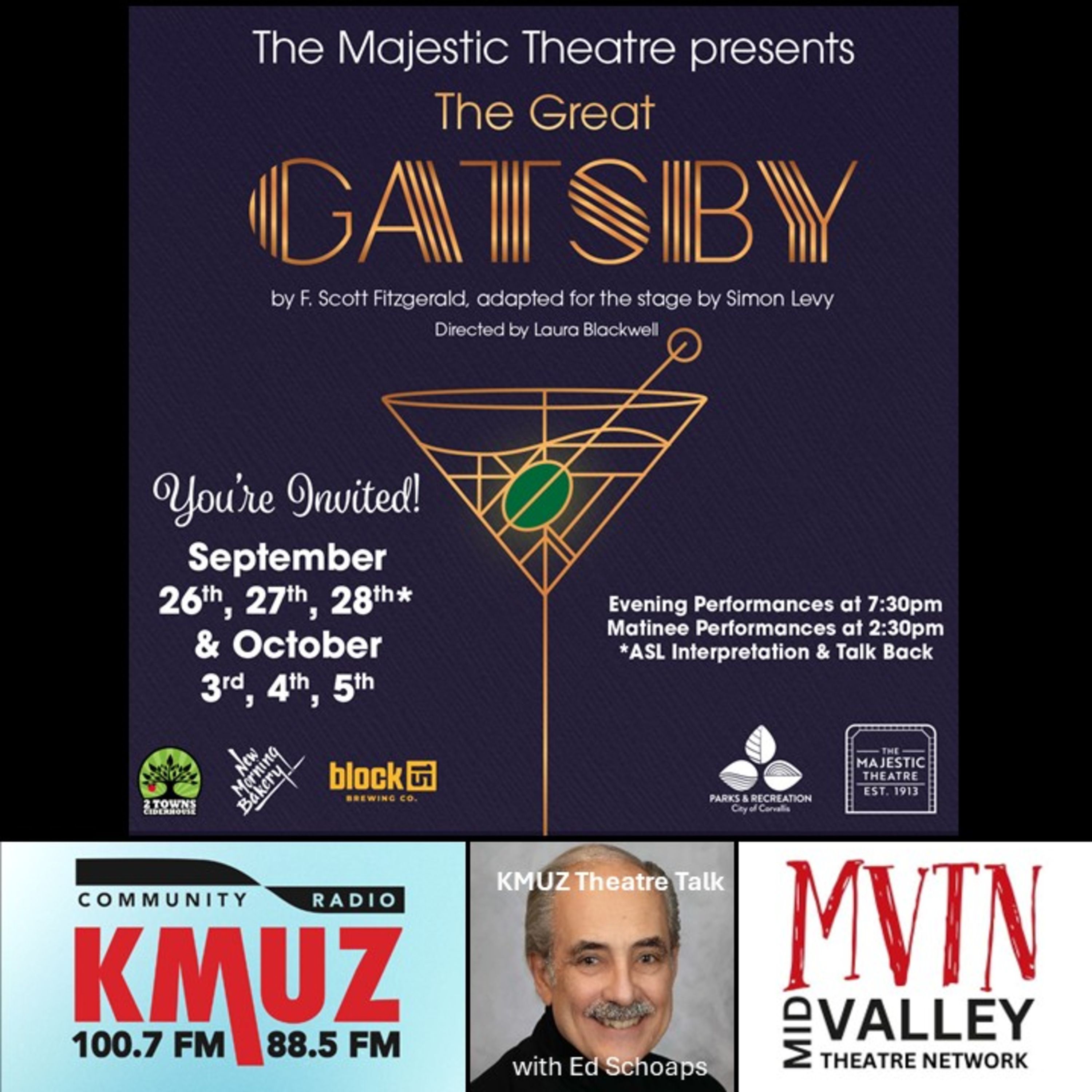 (17:39) THE GREAT GATSBY, F. Scott Fitzgerald’s novel about the idle rich in America’s Jazz Age, may be a century old but it’s as relevant today as ever. Simon Levy’s stage adaptation of Fitzgerald’s story of glamour and decadent excess in the 1920s opens Sept. 26 at The Majestic Theatre in Corvallis. Host Ed Schoaps talks with director Laura Blackwell and actors Garrett Hembree and Steven Lerner about the show.