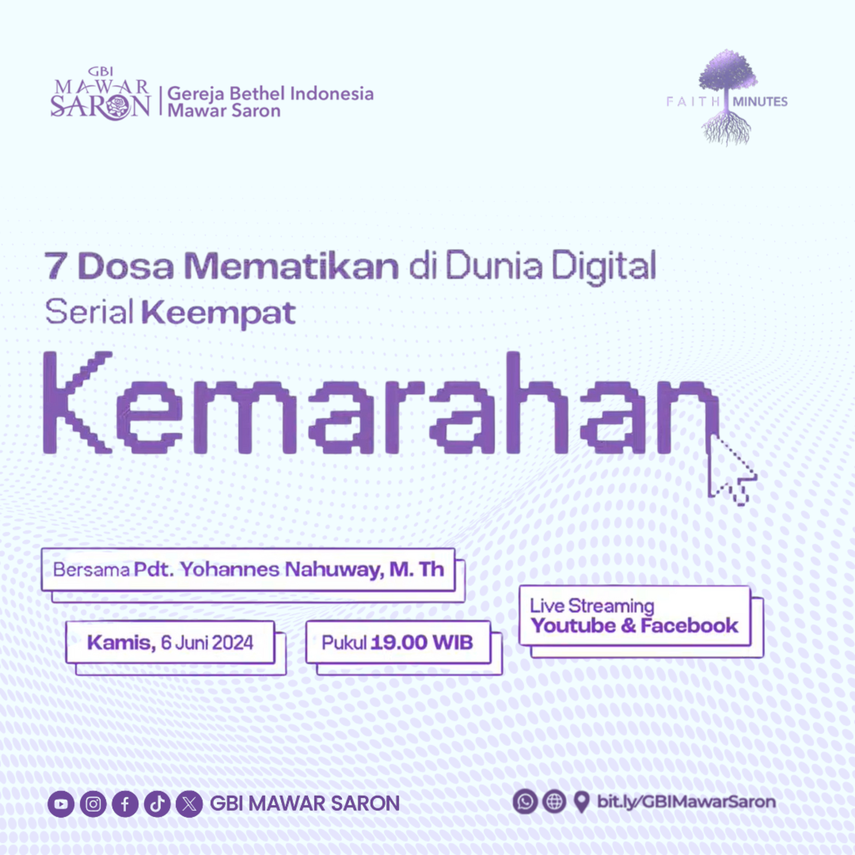 Faith Minutes Live edisi Kamis, 2 Mei 2024 - "7 Dosa Mematikan Di Dunia Digital" Seri Ke-4: “Kemarahan”. Info dan pendaftaran keanggotaan jemaat: WhatsApp Call Center GBI Mawar Saron Jakarta 0811-909-419