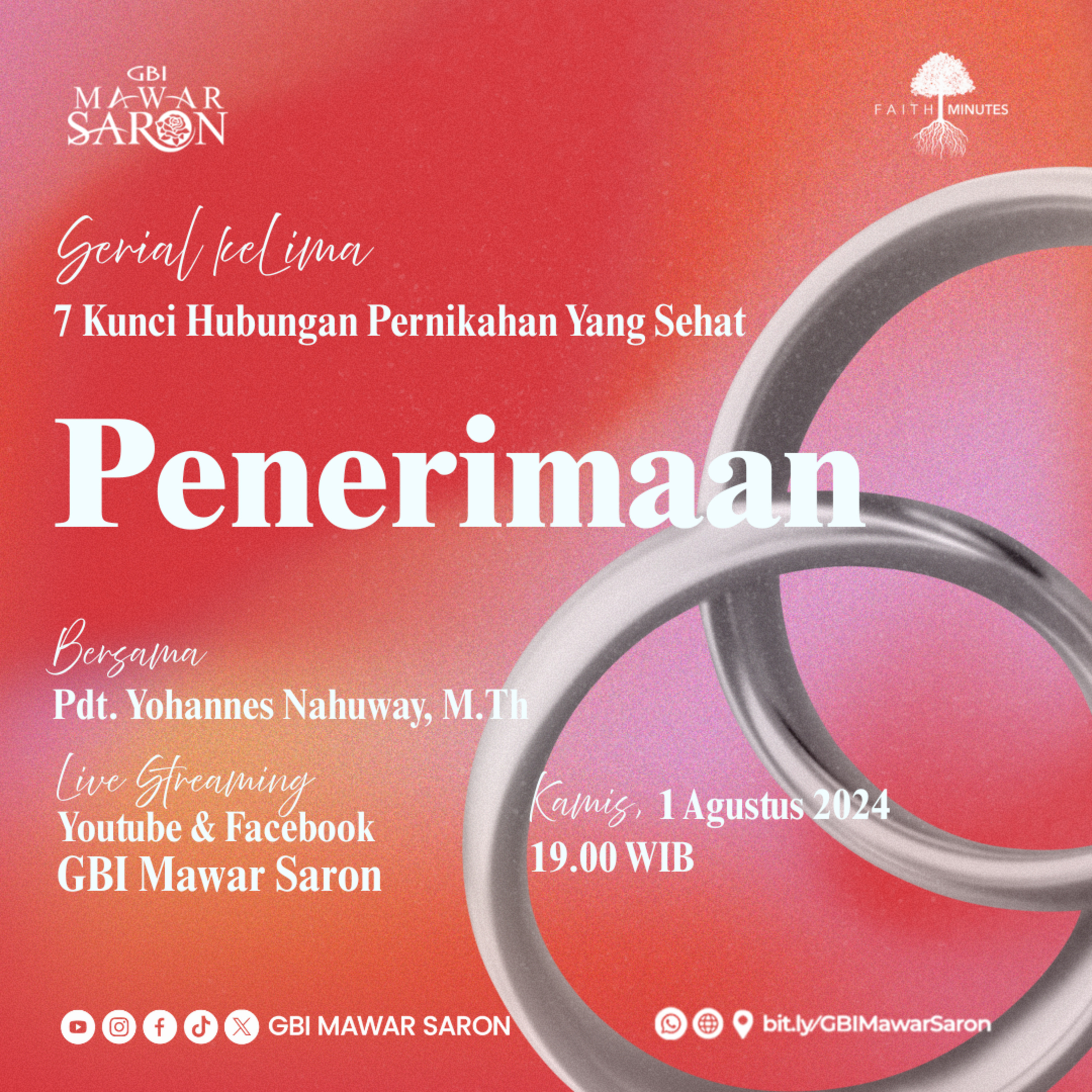 Faith Minutes Live edisi Kamis, 1 Agustus 2024 - "7 Kunci Hubungan Pernikahan Yang Sehat" Seri Ke-5: “Penerimaan”. Info dan pendaftaran keanggotaan jemaat: WhatsApp Call Center GBI Mawar Saron Jakarta 0811-909-419
