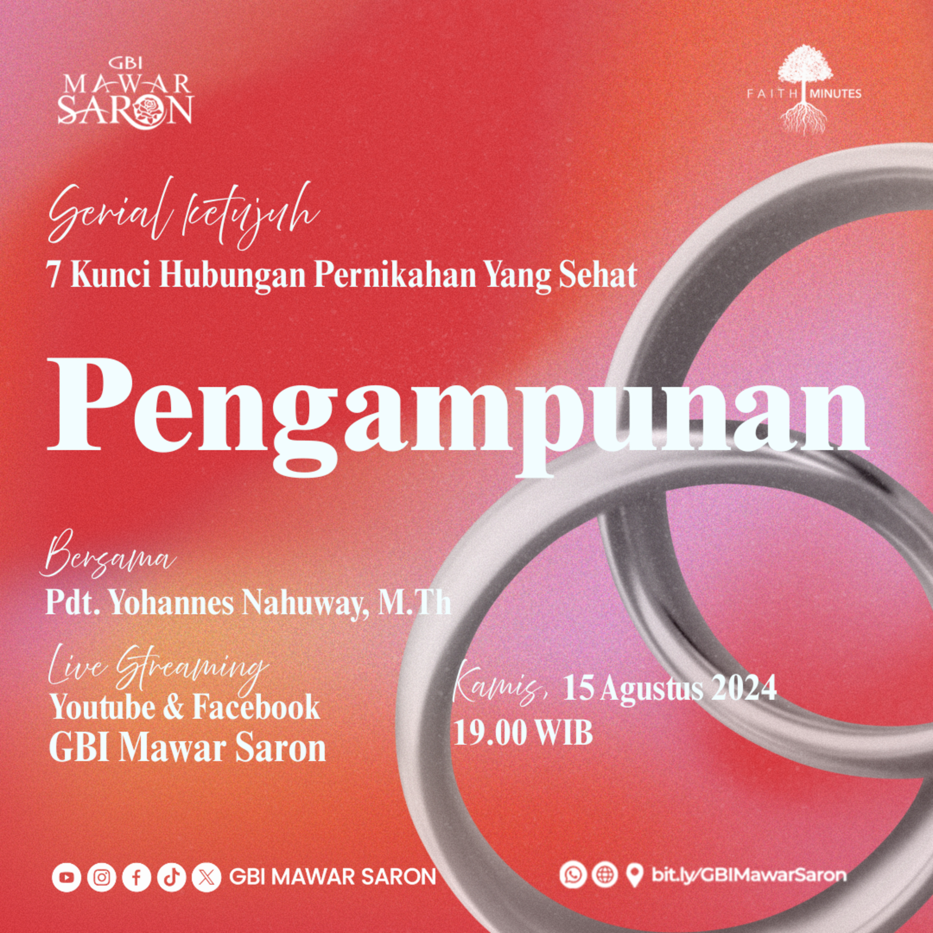 Faith Minutes Live edisi Kamis, 15 Agustus 2024 - "7 Kunci Hubungan Pernikahan Yang Sehat" Seri Ke-7: “Pengampunan”. Info dan pendaftaran keanggotaan jemaat: WhatsApp Call Center GBI Mawar Saron Jakarta 0811-909-419