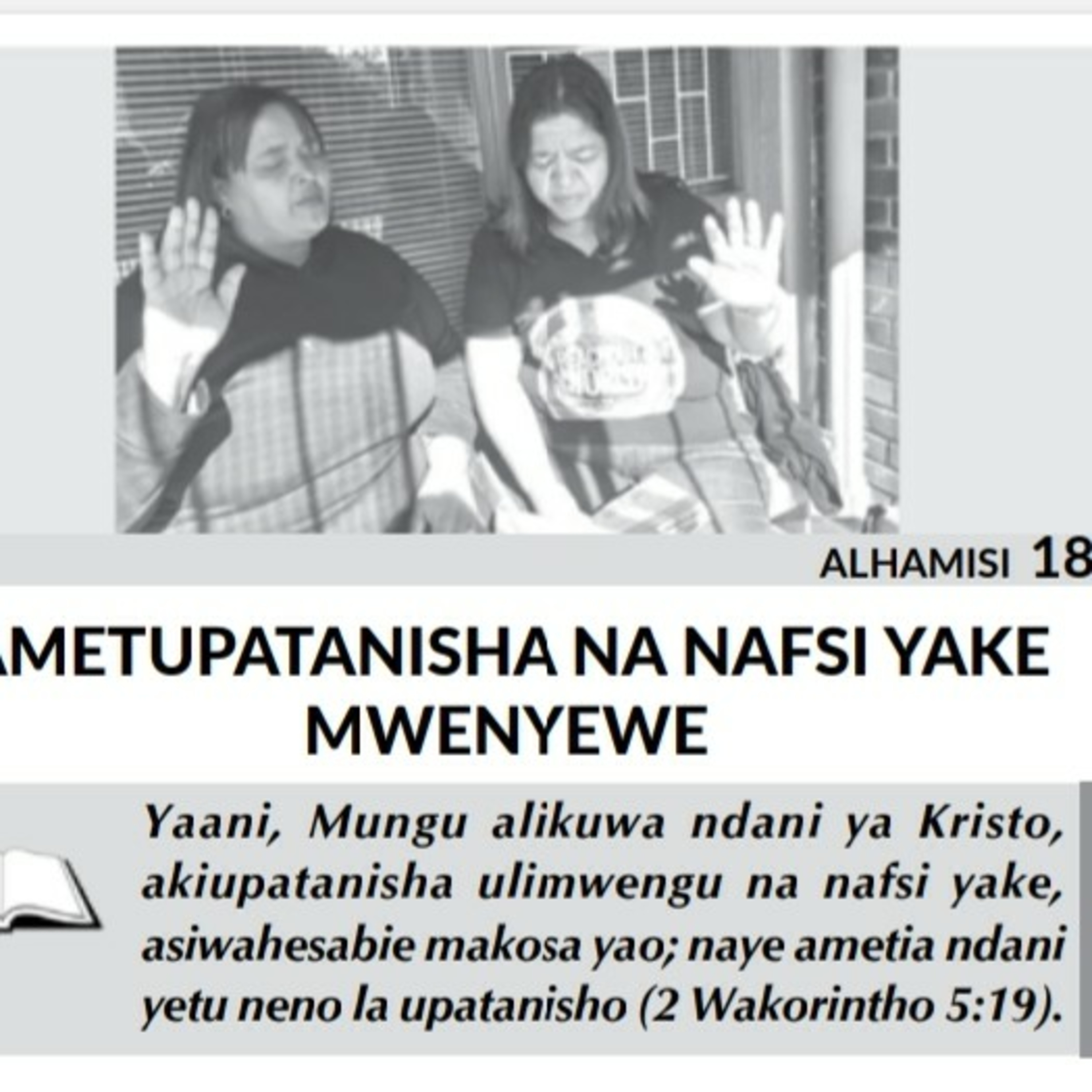 Mungu alikuwa ndani ya Kristo akiupatanisha ulimwengu na nafsi yake. Hakuna wokovu nje ya Kristo Yesu, ulimwengu lazima uje hilo. Tumepewa huduma hii ya upatanisho na lazima tuuambie ulimwengu mzima.