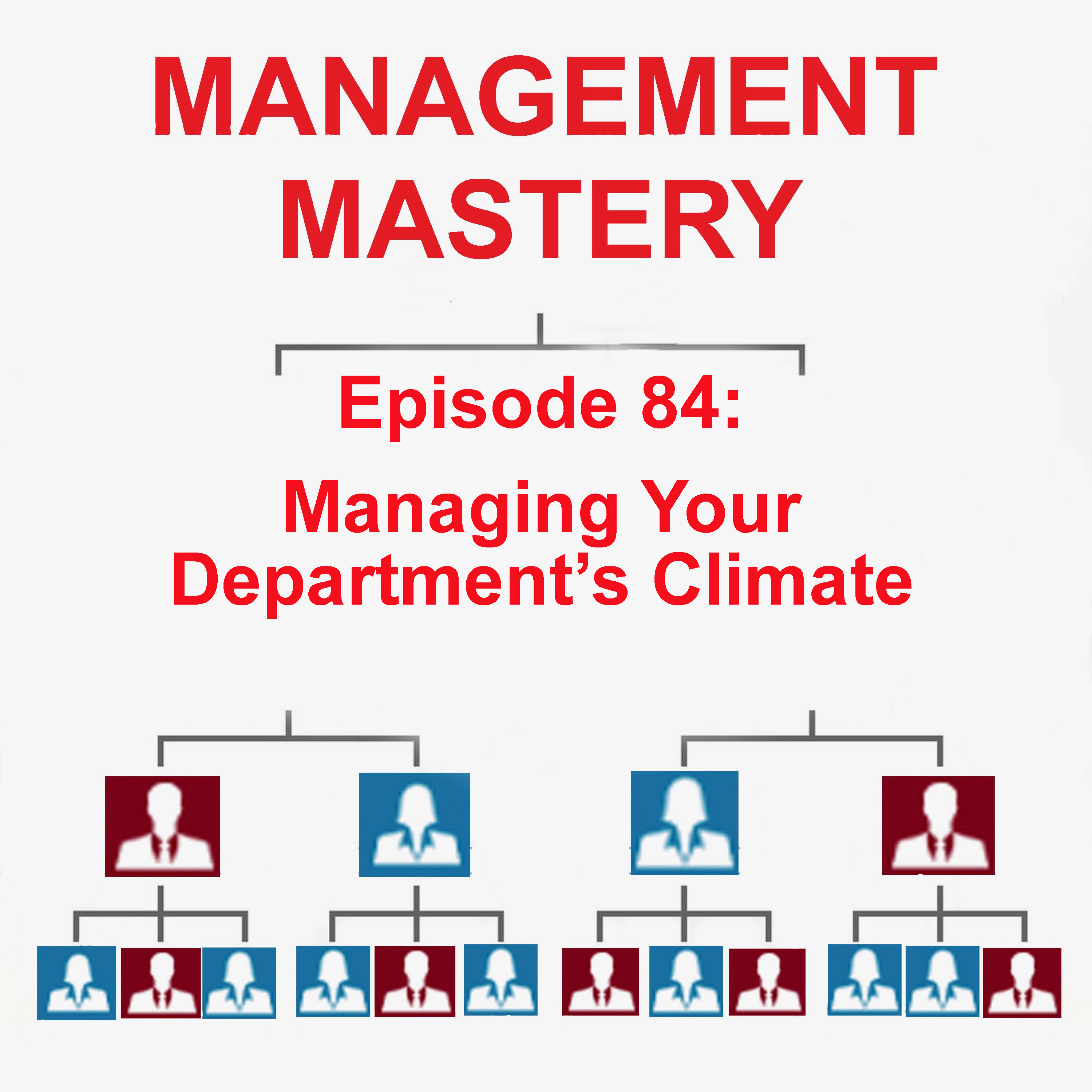 : The climate of a department involves how staff interact, engage, and exchange ideas to create a positive work environment. It is important to build a healthy team climate to ensure that staff feel comfortable, confident, and supported when around one another. Many managers don’t focus on climate but simply accept the way it is when they arrive. Thus, they possibly miss a major opportunity to build a more effective and efficient team. We’ll focus on evaluating your current climate, identifying opportunities and possibly improving it in this episode.