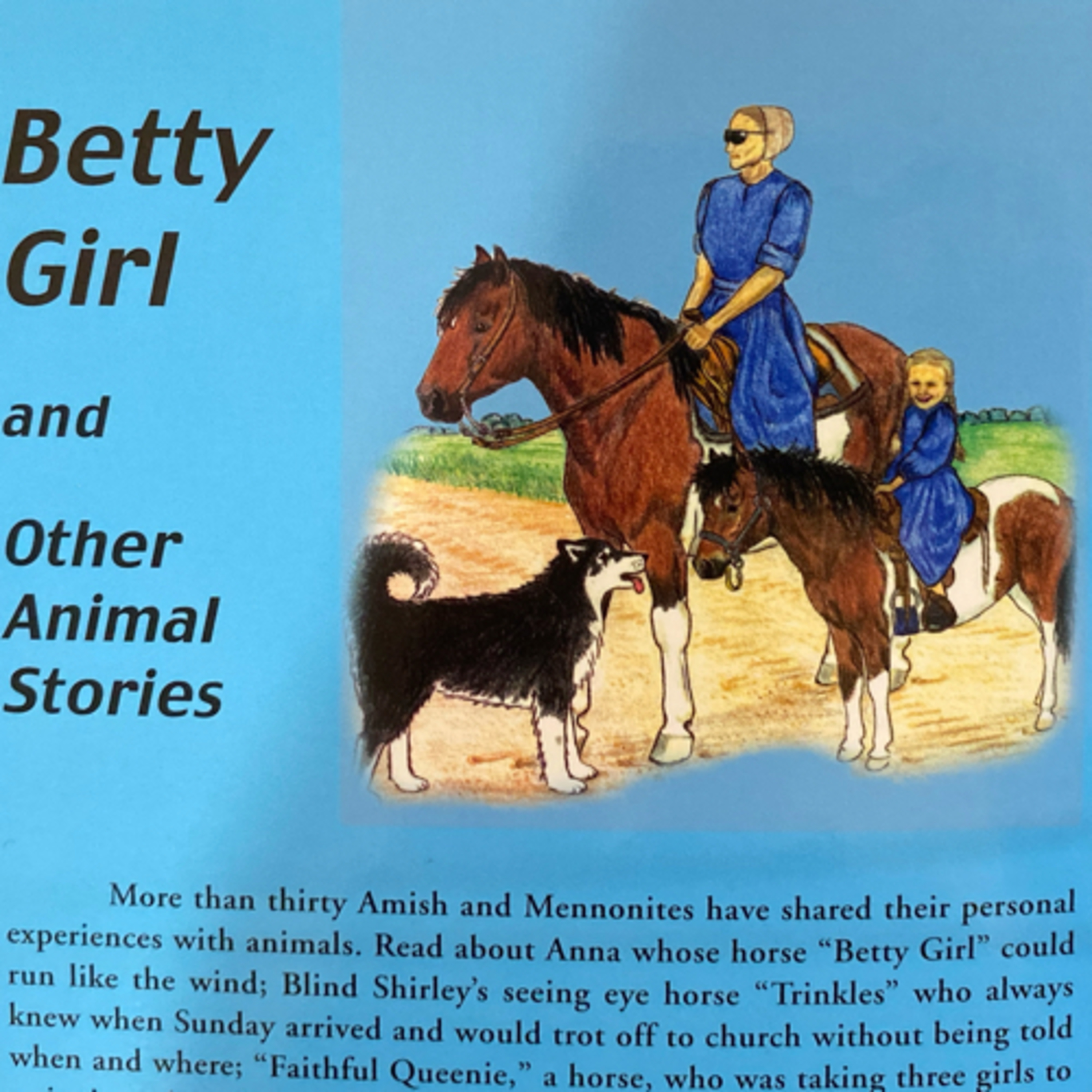 Great book titled, “Betty Girl and Other Animal Stories” about animals and their interactions with people compiled by Carrie Bender; published by Masthof Press; 2004; Amish and Mennonite authors / fun, pure and interesting.