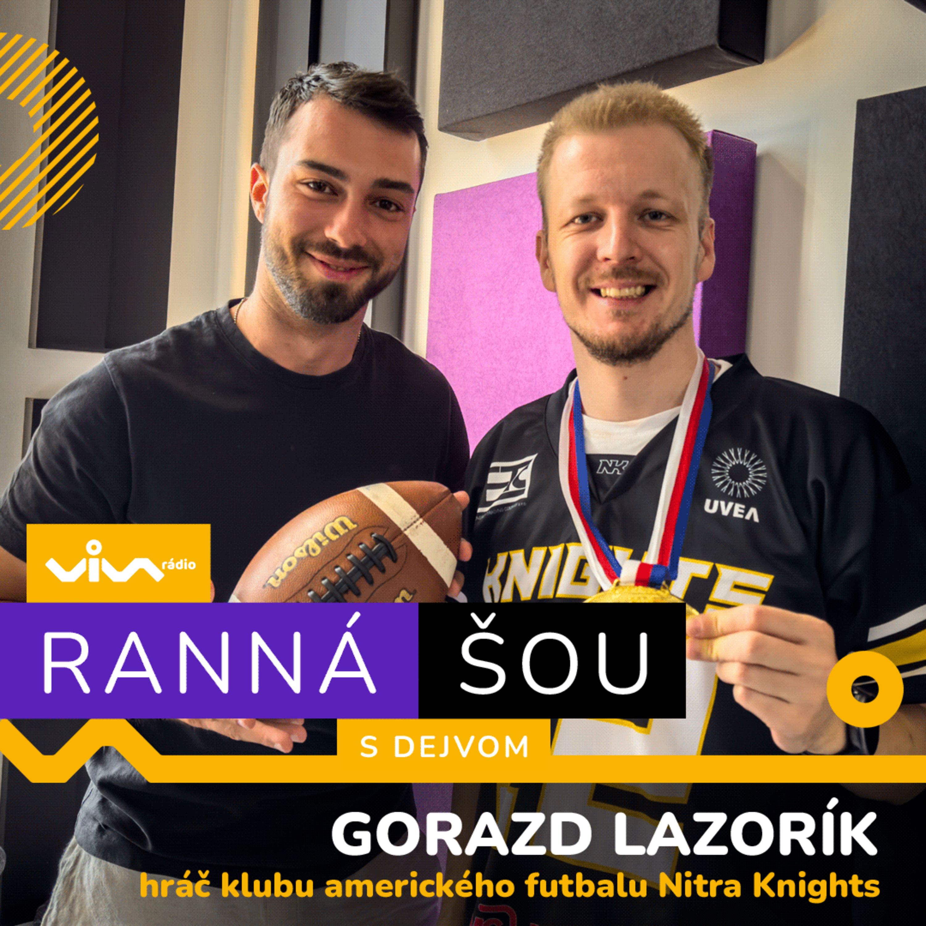 Do rannej šou si tentoraz Dejvo pozval hráča amerického futbalu Nitra Knights Gorazda Lazorika. Hrajú jedenásti na jedenástich, s loptou a pred plnou tribúnou, ale futbal to nie je. Pribinove mesto si podmaňuje americký futbal, pod Zobor prináša takmer tisícové návštevy a priťahuje aj prestížnych sponzorov, veľké značky.„Nie sme len klub, sme rodina a komunita, preto to je pre mňa osobná téma,“ netají GORAZD LAZORÍK, hráč a marketingový manažér Nitra Knights, ktorý s klubom zaspáva i sa zobúdza.Počúvaj rannú šou rádia Viva každý pracovný deň od 6:00 - 9:00. Ak si nestihol rozhovor s našim hosťom, všetko nájdeš v repríze na všetkých podcastových platformách.
