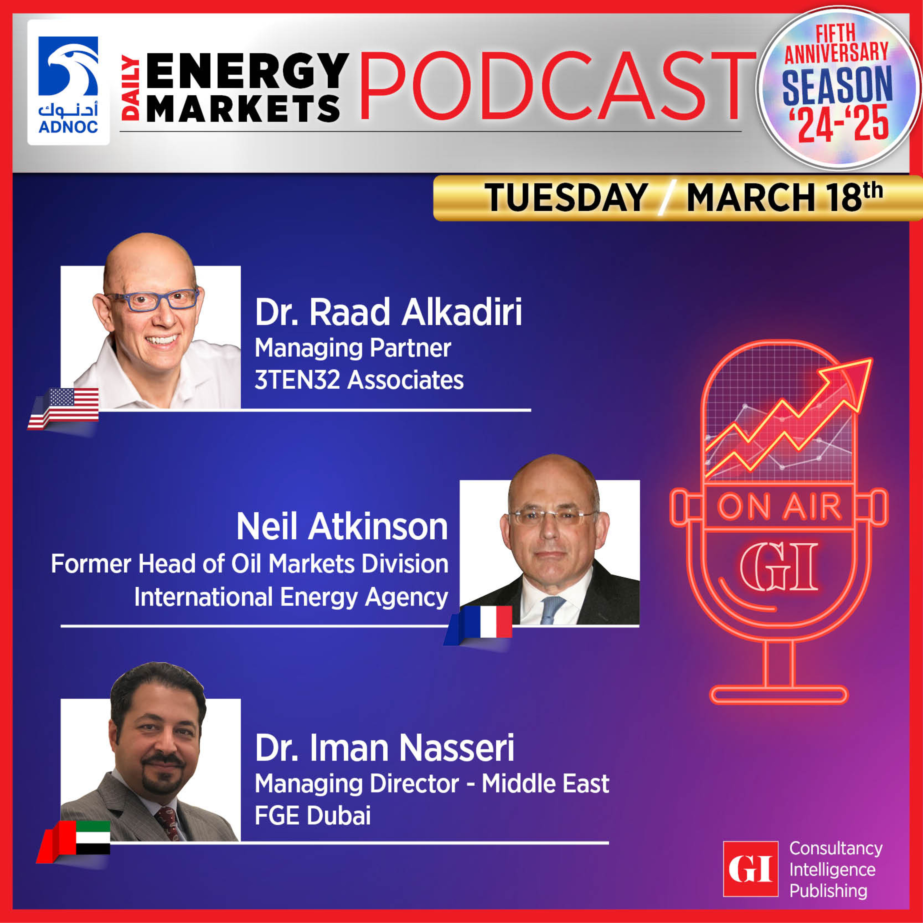 he Daily Energy Markets Podcast discussed the direction of travel for oil markets following recent geopolitical tensions in the Middle East. Dr. Raad Alkadiri, Managing Partner, 3TEN32 Associates; Dr. Iman Nasseri, Managing Director - Middle East, FGE Dubai; and Neil Atkinson, Former Head of Oil Markets Division, International Energy Agency weighed in their views. What is the main driver of Brent crude oil prices moving up into the $70s: 1. Supply Disruption Concerns; 2. Renewed China Demand; OR 3. Trump Fear of Unknown? VOTE here: https://x.com/gulf_intel/status/1901891655608787097 OR here: https://www.linkedin.com/feed/update/urn:li:activity:7307657514014183425