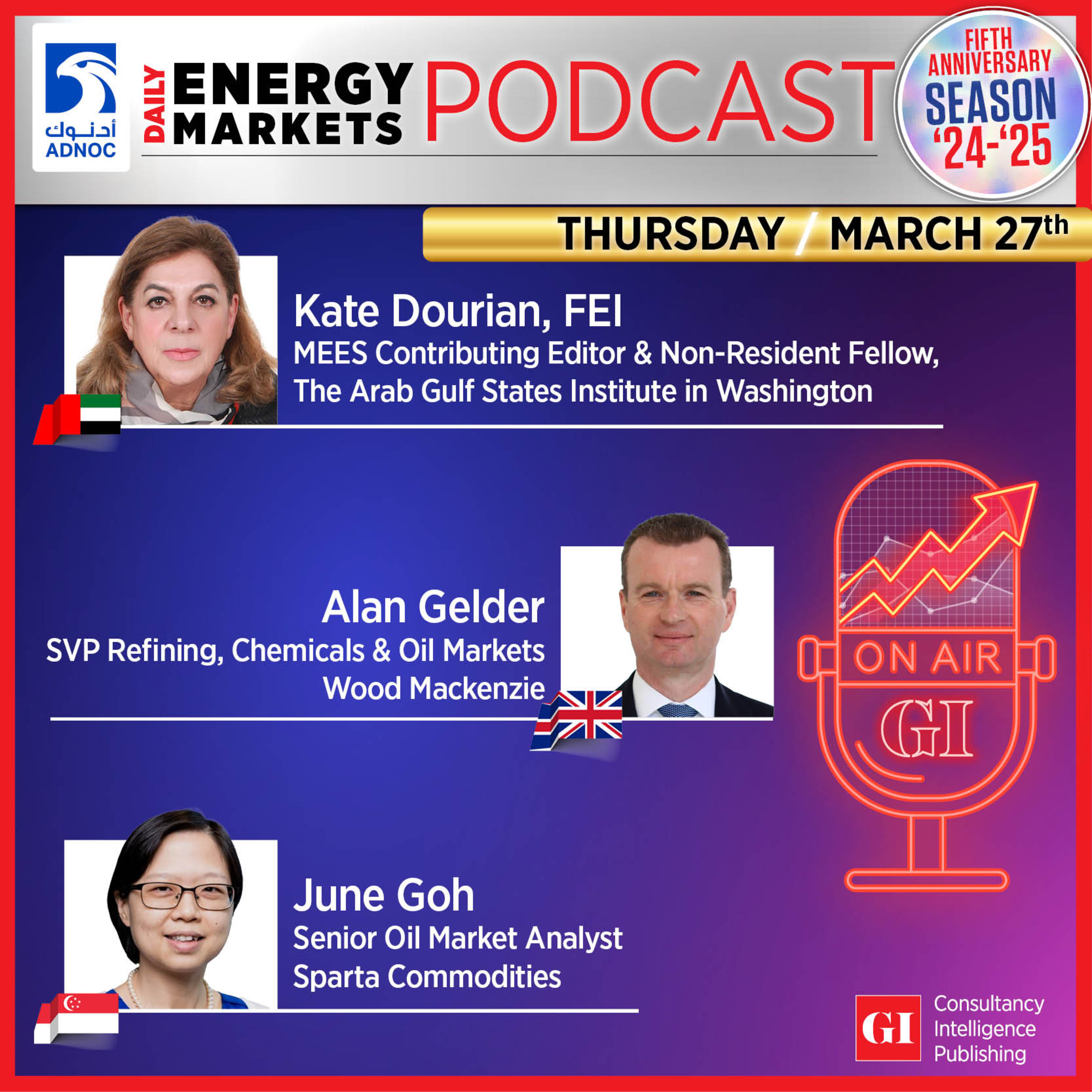 The Daily Energy Markets Podcast continues unpacking the implications of the US’ tariffs impositions in key sectors. Listen in to Alan Gelder, SVP Refining, Chemicals & Oil Markets, Wood Mackenzie; Kate Dourian, FEI, MEES Contributing Editor & Non-Resident Fellow, The Arab Gulf States Institute in Washington; and June Goh, Senior Oil Market Analyst, Sparta Commodities, for insights in Europe, the Middle East, and Asia in today’s Daily Energy Markets Podcast. Oil prices are immune to trade war due to massive idle supply available: True or False? VOTE here: https://x.com/gulf_intel/status/1905152723399455207 OR here: https://www.linkedin.com/feed/update/urn:li:activity:7310918566810202113