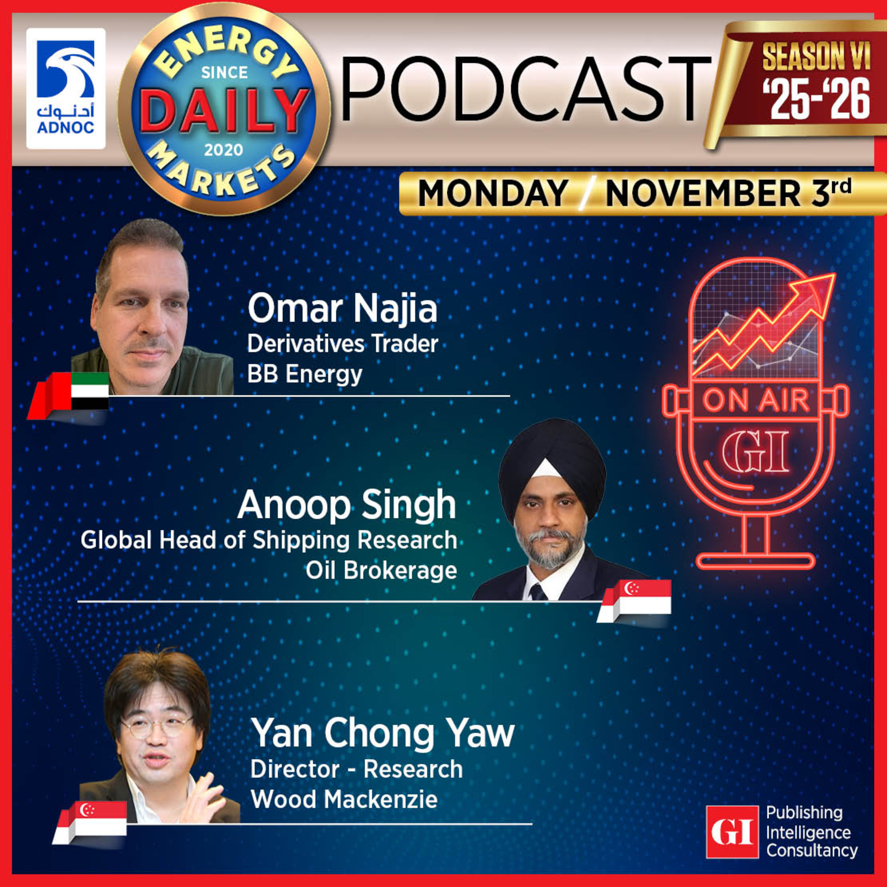 On today’s podcast from ADIPEC 2025, Omar Najia (BB Energy) predicted oil prices will rise sharply, dismissing bearish EIA forecasts and calling current prices “cheap.” Anoop Singh (Oil Brokerage) highlighted Chinese buying and storage as key price supports, while Yan Chong Yaw (Wood Mackenzie) remained short-term bearish, citing stagnant Chinese demand and limited global spare capacity.