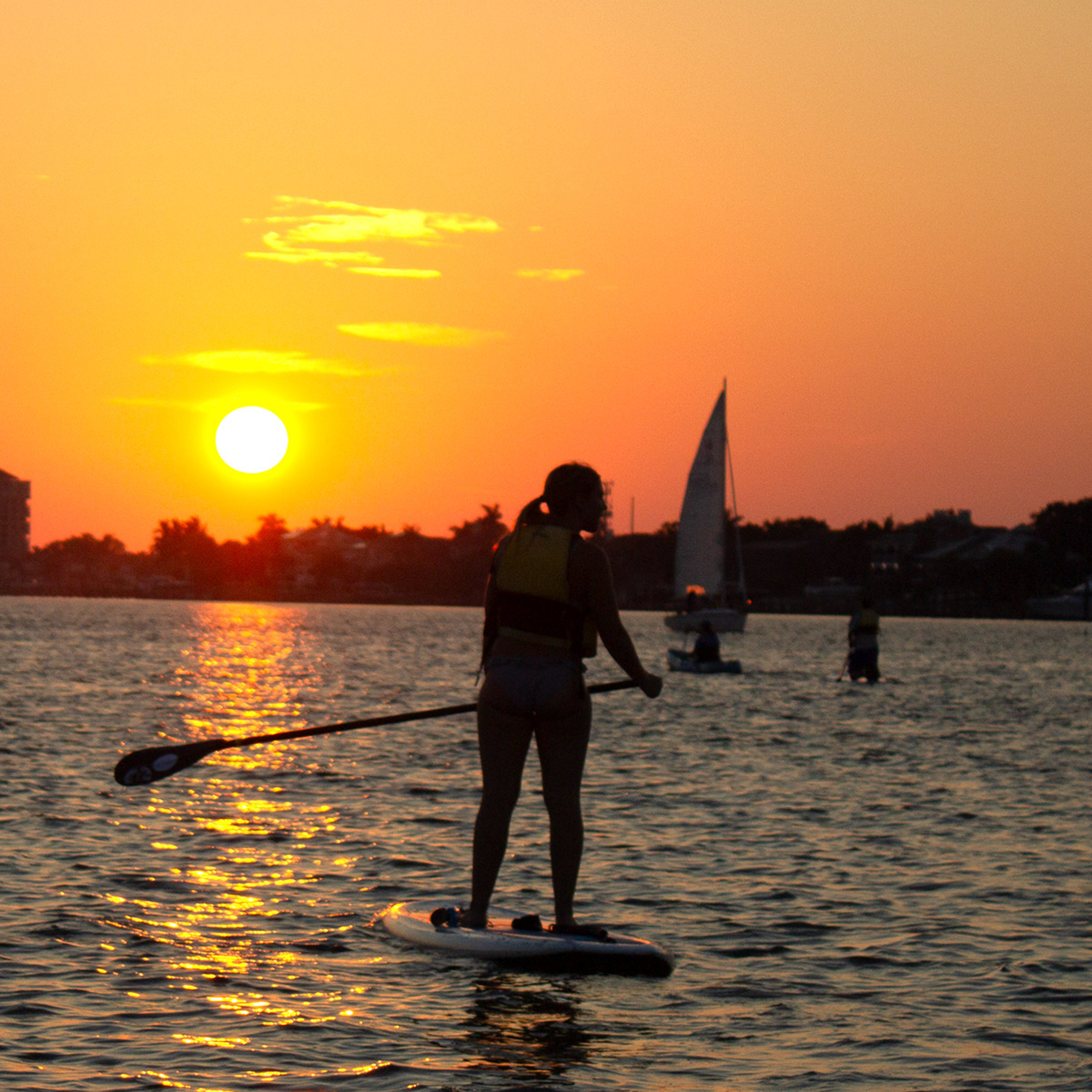 As the golden glow of the setting sun cast rays over Boca Ciega Bay, a group of more than 20 Eckerd College students paddled out of Frenchman’s Creek for the Glow-n-Row—a Waterfront-sponsored event inviting students to explore the waterways as the sun set.