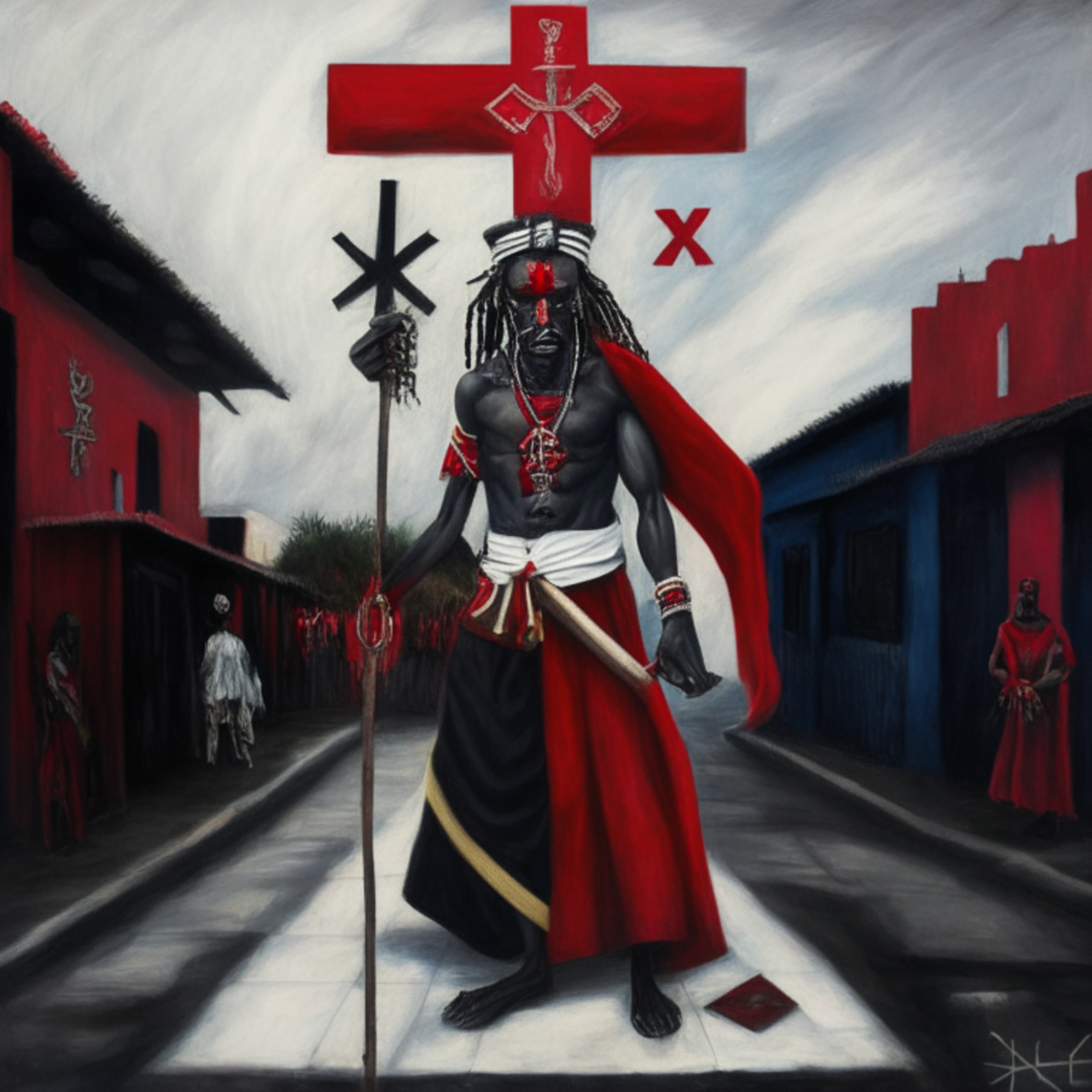 Endorphin thinks to call up Elegua. The receptionist of the Orishas, the one you call when you want to call upon the others. The one who stands at all crossroads, who stands at the gate of life and death, whose favorite prank is to confuse love and hate between two young lovers. Not to mention a real looker, hella charming, and hilarious when his humor turns dark.