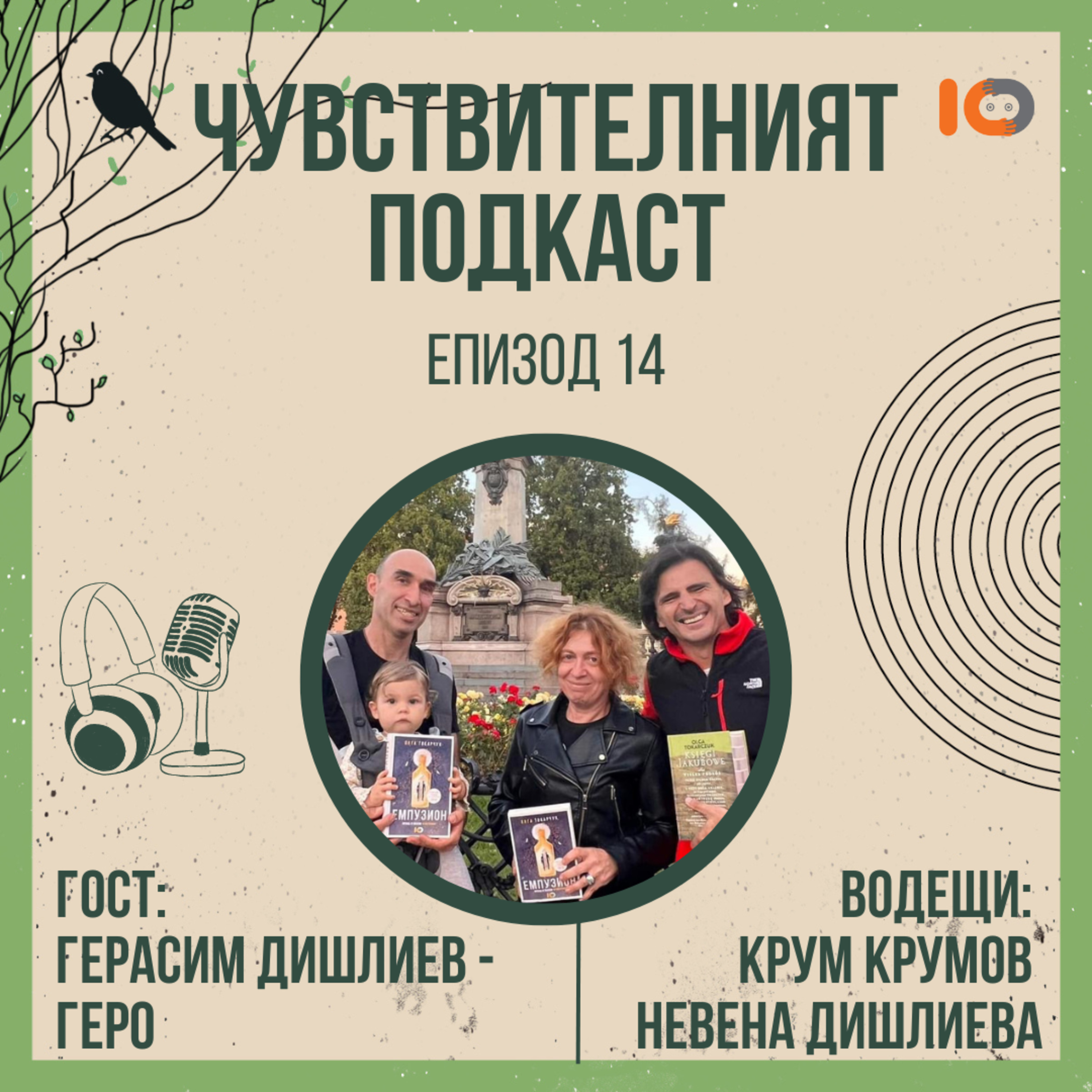 Този път специален гост в „Чувствителният подкаст“ е актьорът и мим Герасим Дишлиев, брат на нашия водещ Невена. Двамата с нейния партньор-водещ Крум ще разпитат Геро за пътешествието му от Париж до Свиленград с велосипед, по време на което изнася по едно представление във всеки град, където се спира. Ще разберем малко повече за самостоятелното му представление „Монолог с куфар“, за това какво е нужно за един актьор, докато е на сцената, дали актьорството помага в личния му живот и за изненадващото му за повечето незапознати влечение по физиката. А ето и линкове към някои от книгите, споменати по време на разговора и специален откъс от монолог от „Емпузион, изигран от Геро: