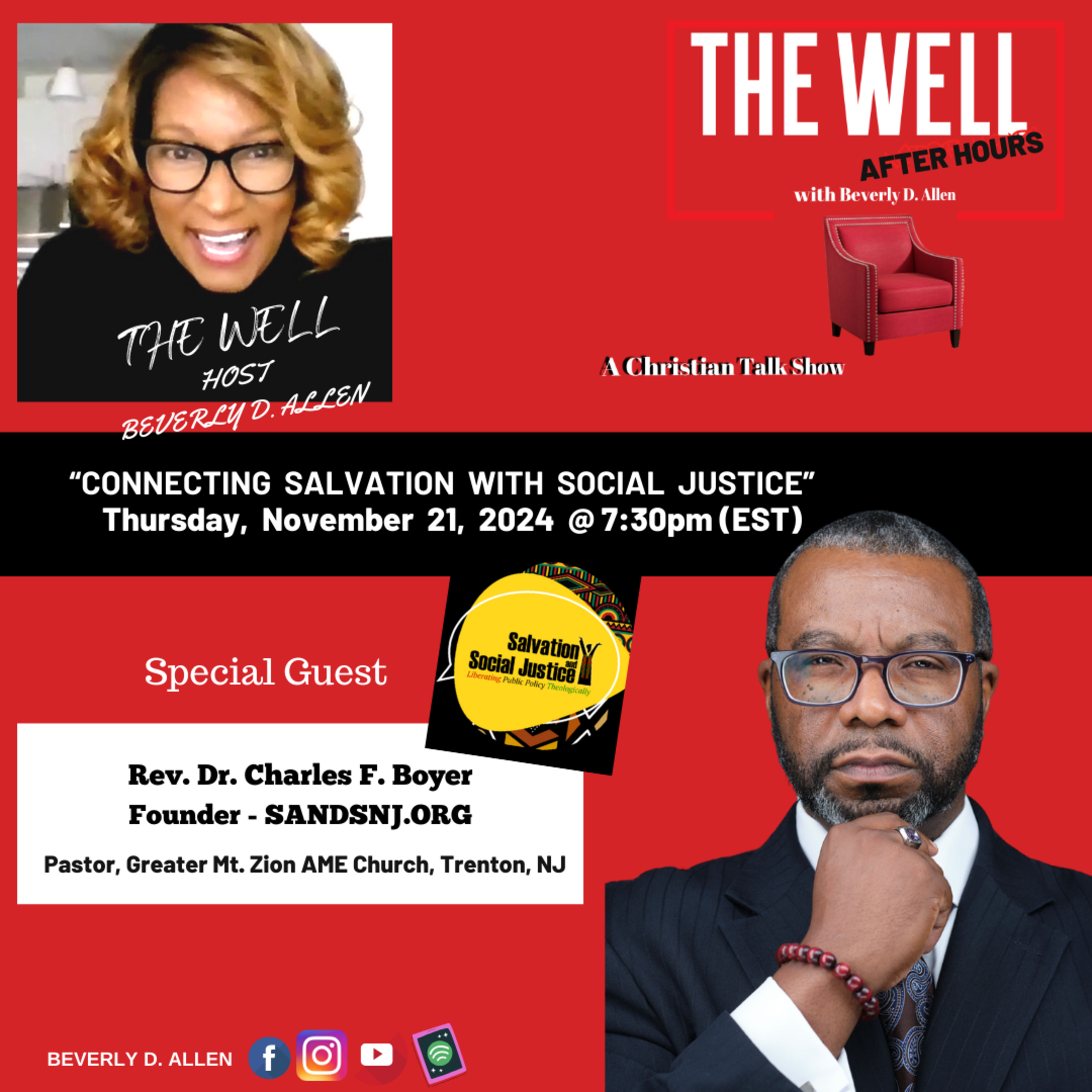 ON THE WELL AFTER HOURS this week, our Special Guest will be Rev. Dr. Charles F. Boyer; Pastor of Greater Mt. Zion AME Church. Dr. Boyer, who is also the Founder & Executive Director of SAVATION & SOCIAL JUSTICE organization, will address the importance connecting the issue of salvation and social justice and share the success and power of obtaining policy changes Theologically!