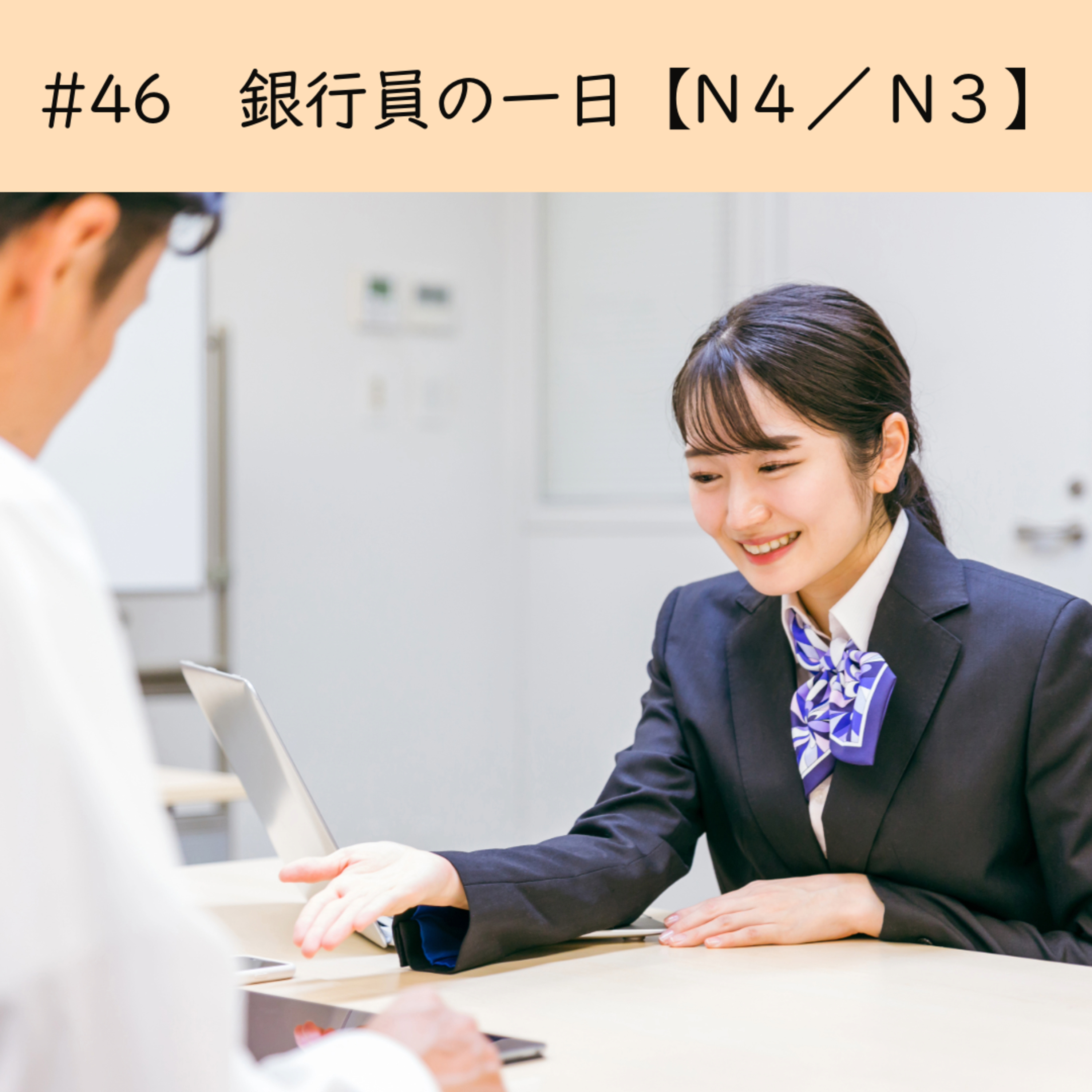 N4、N3レベルのショートストーリー「銀行員の一日」。銀行員は、朝から晩まで、どんな生活をしているでしょうか。聞いてみてくださいね。