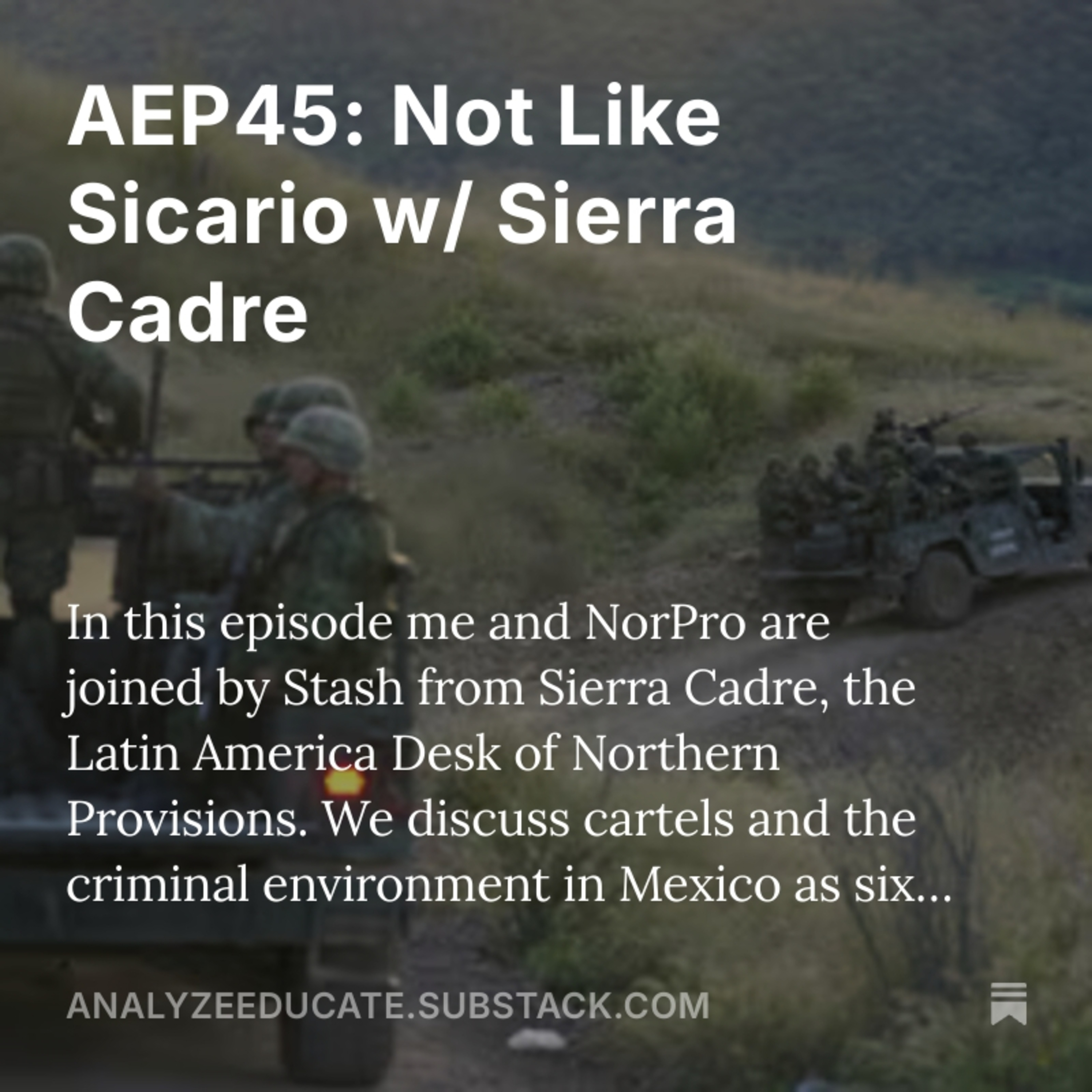 In this episode me and NorPro are joined by Stash from Sierra Cadre, the Latin America Desk of Northern Provisions. We discuss cartels and the criminal environment in Mexico as six drug cartels are designated as Foreign Terrorist Organizations by the Trump administration.
