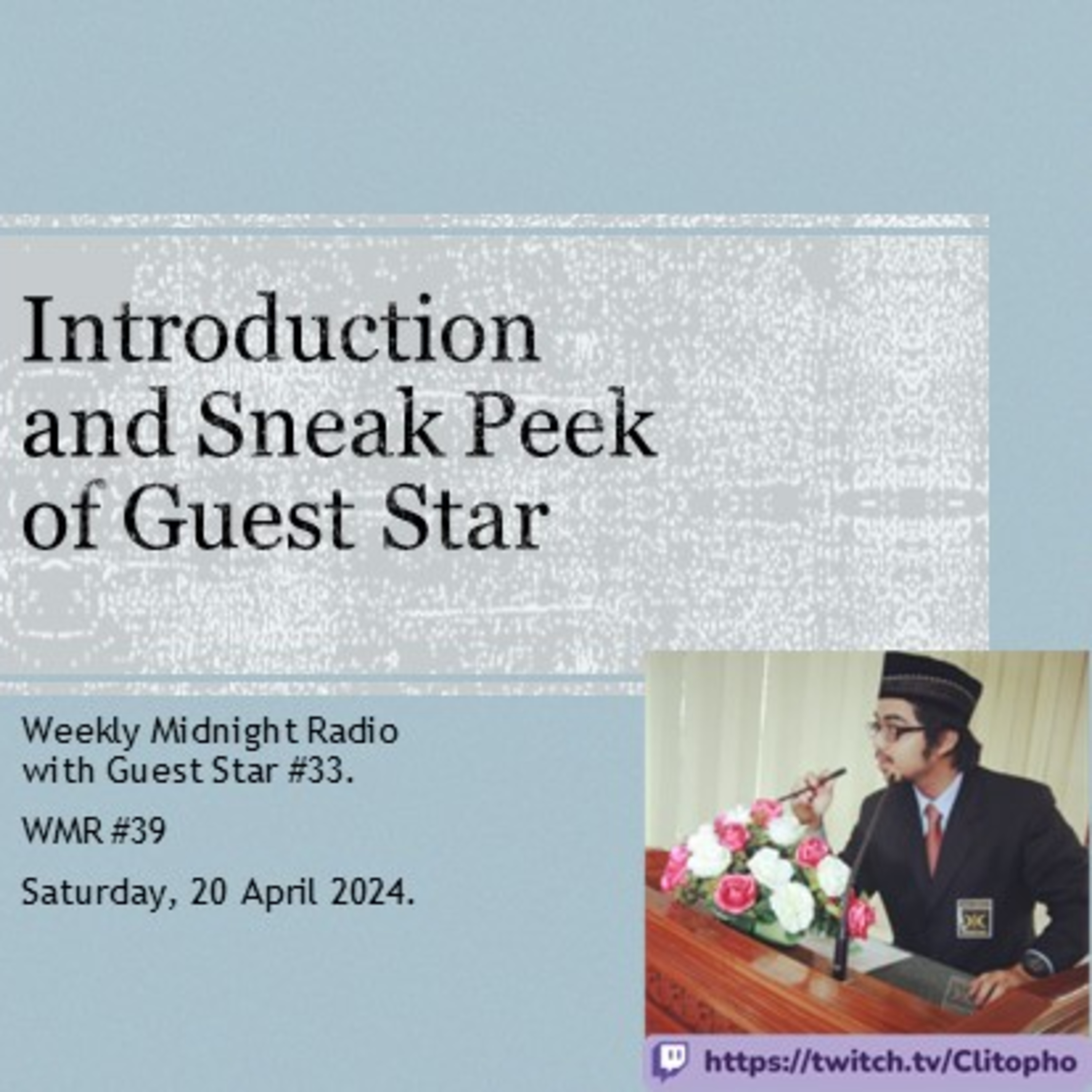 Weekly Midnight Radio is a program aired every Saturday, 9 PM to 12 AM (GMT+7), on https://twitch.tv/Adli_HM. This program consists of three segments, where there will be a guest star, and the purpose is to introduce/get to know more about this guest star. In this episode, the guest star is Clitopho or @robithuhukama7901.