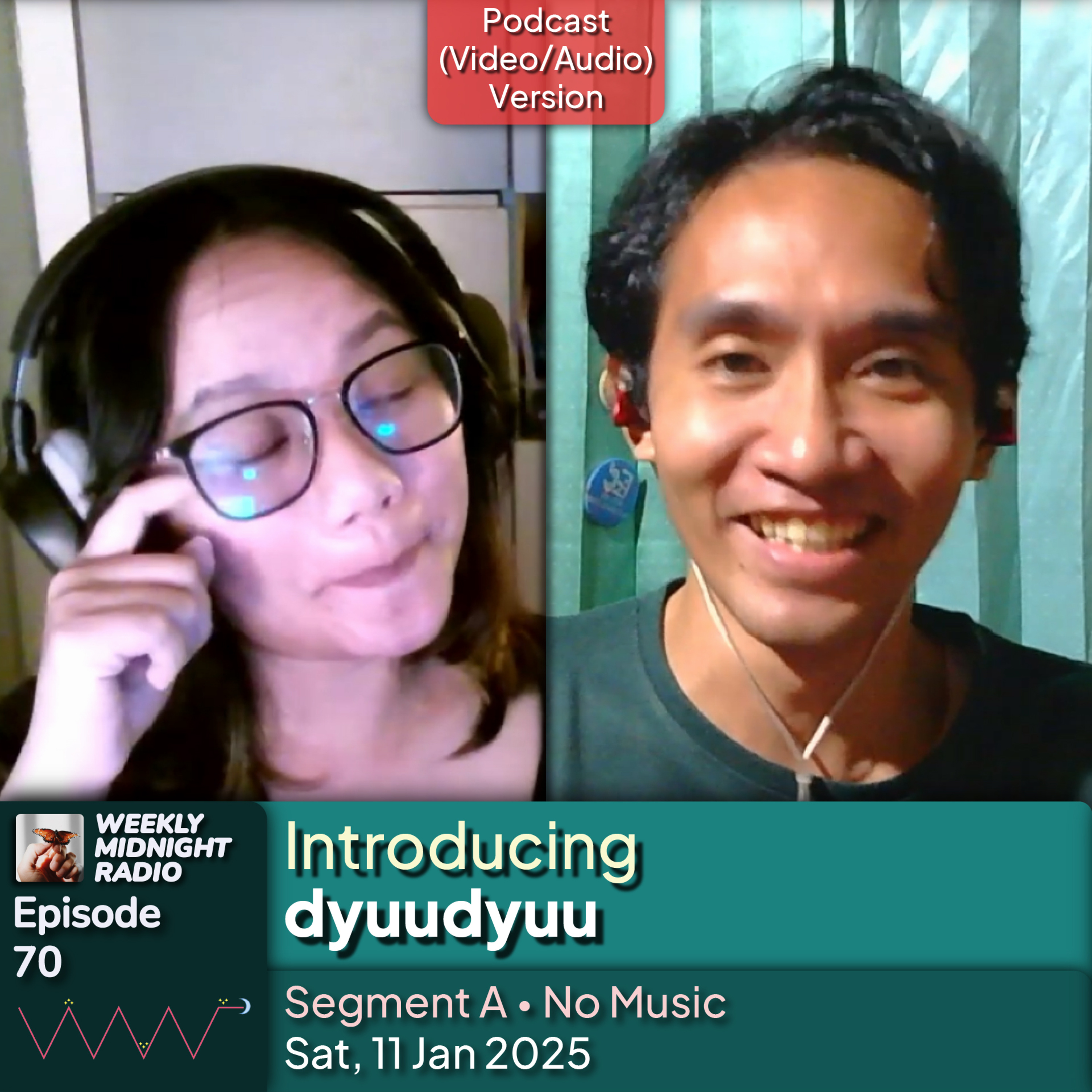 Weekly Midnight Radio is a program aired every Saturday, 9 PM to 12 AM (GMT+7), on https://twitch.tv/Adli_HM and https://www.youtube.com/@Adli_HM. This program consists of three segments, where there will be a guest star, and the purpose is to introduce/get to know more about this guest star. In this episode, the guest star is dyuudyuu.