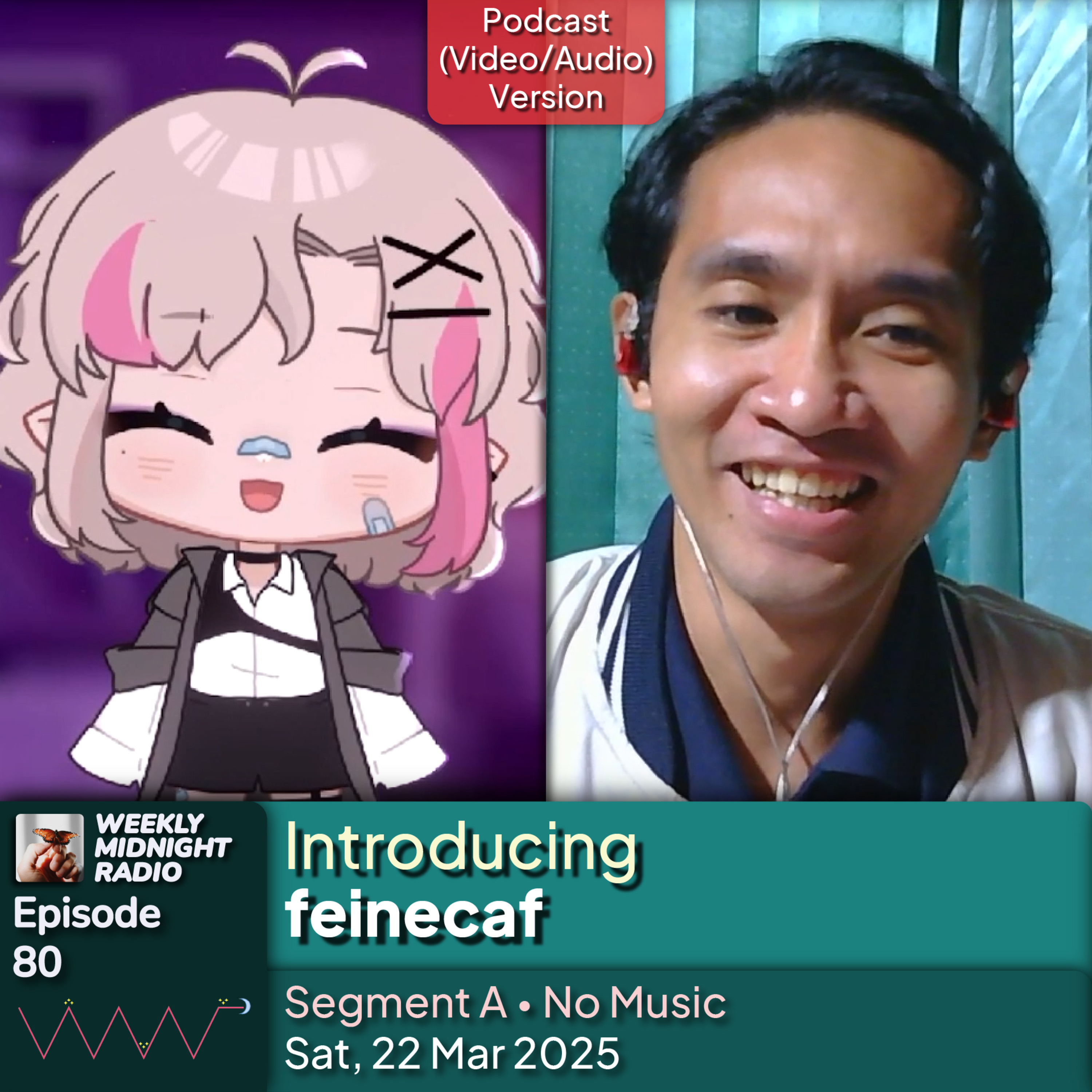 Weekly Midnight Radio is a program aired every Saturday, 9 PM to 12 AM (GMT+7), on https://twitch.tv/Adli_HM and https://www.youtube.com/@Adli_HM. This program consists of three segments, where there will be a guest star, and the purpose is to introduce/get to know more about this guest star. In this episode, the guest star is feinecaf aka fein.