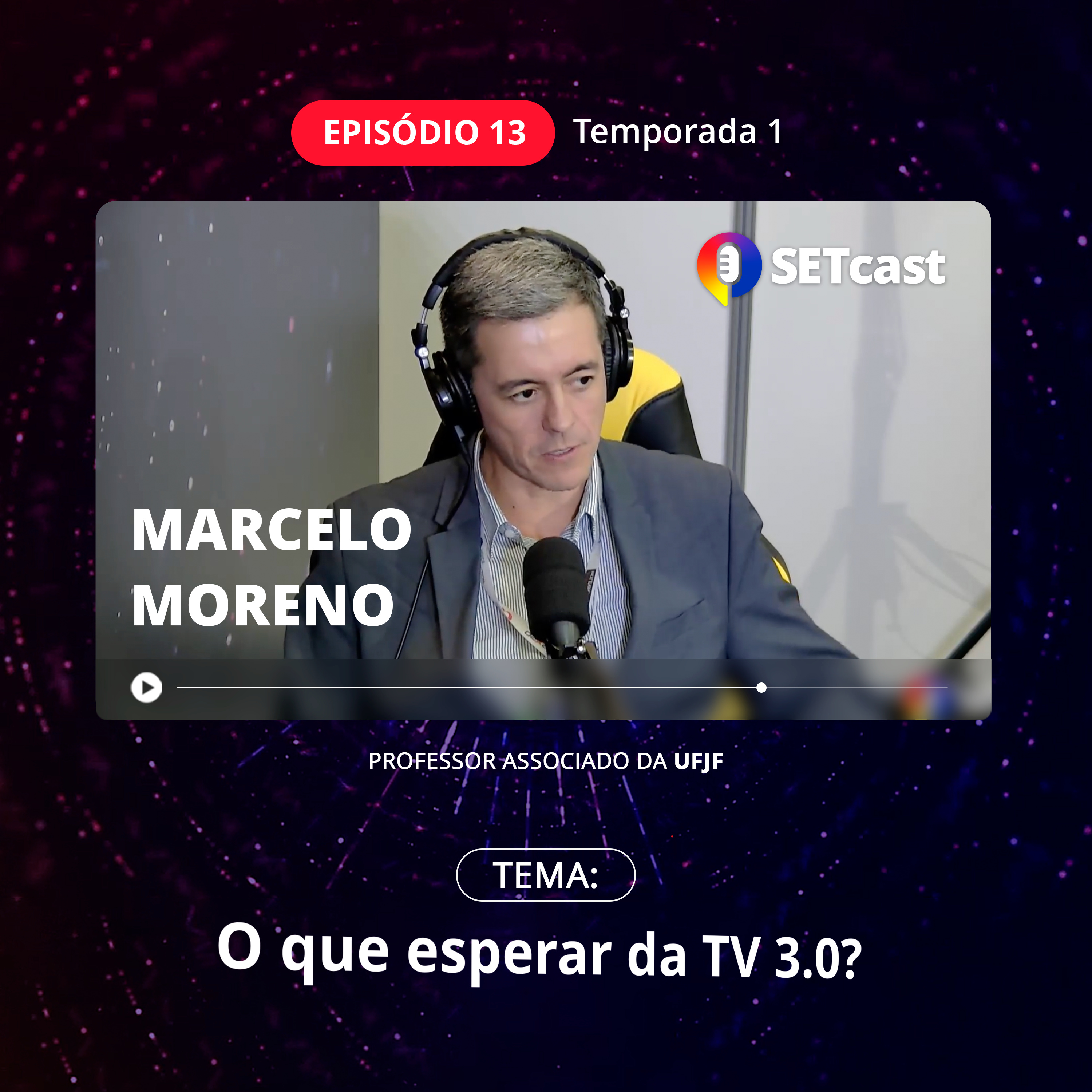 Deisy Feitosa e Bruno Martins, apresentadores do SETcast, conversam com Marcelo Moreno sobre pesquisas no Brasil e no exterior relacionadas à TV 3.0.