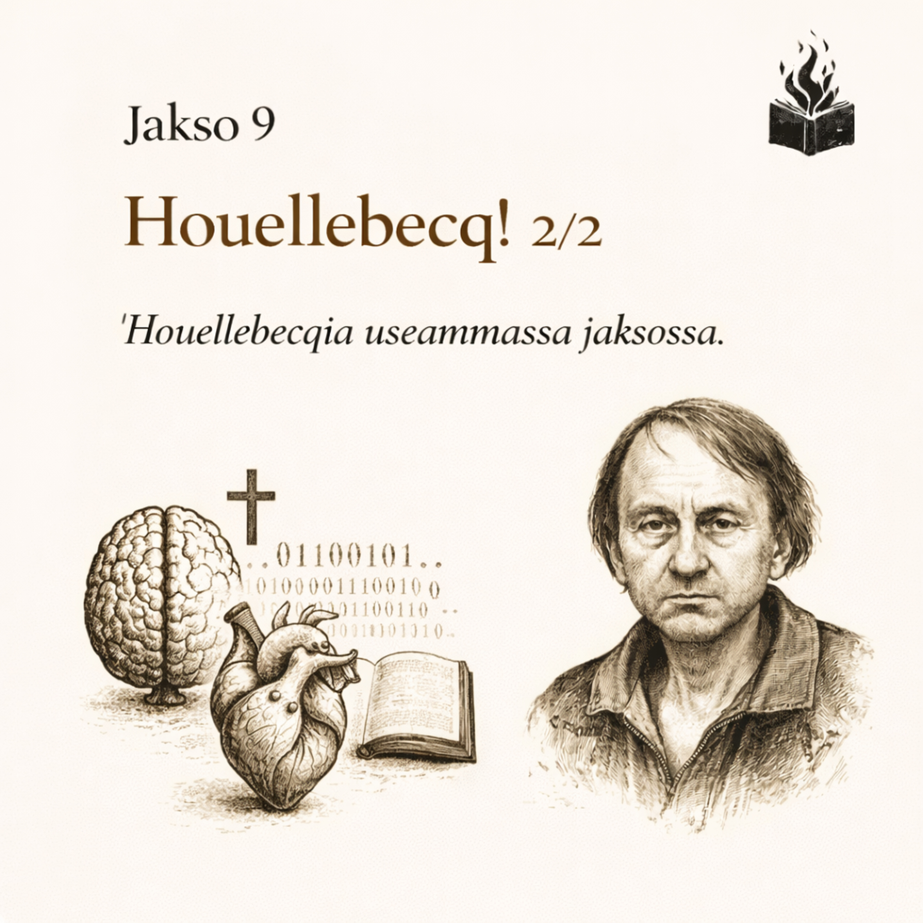 Kirjarovion yhdeksännessä jaksossa jatkamme edellisen jakson aiheella. Käsittelemme tässä jaksossa Houellebecqin suhtautumista rakkauteen, seksiin ja ihmiselämään. Keskustelua käydään myös elämän Suurista Kysymyksistä, tekoälystä, teologiasta ja paljon muusta.
