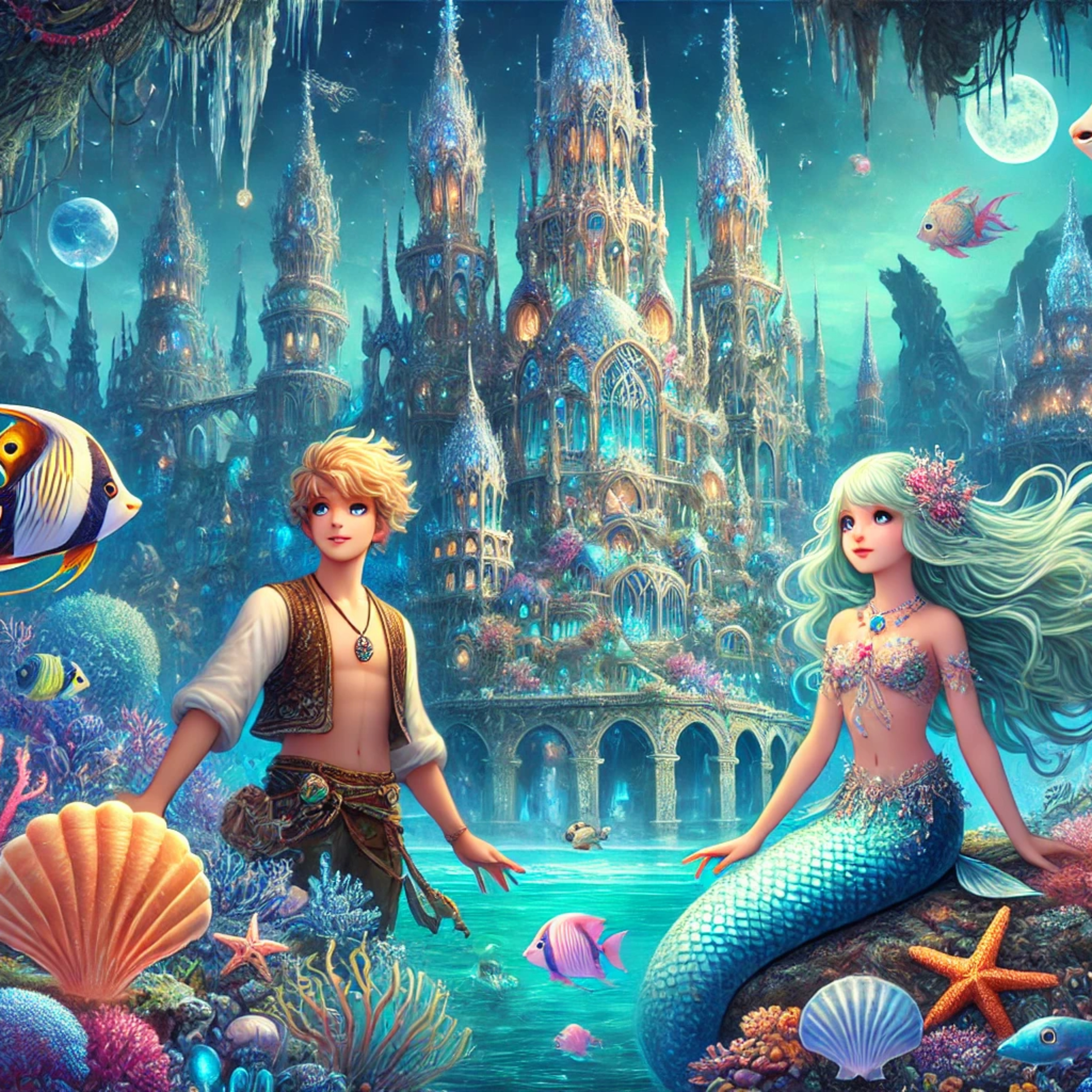 Now, let's visualize the enchanting city of Aquamaris with its glowing coral buildings, colorful fish, and the adventurous Lucas and Princess Marina embarking on their quest.