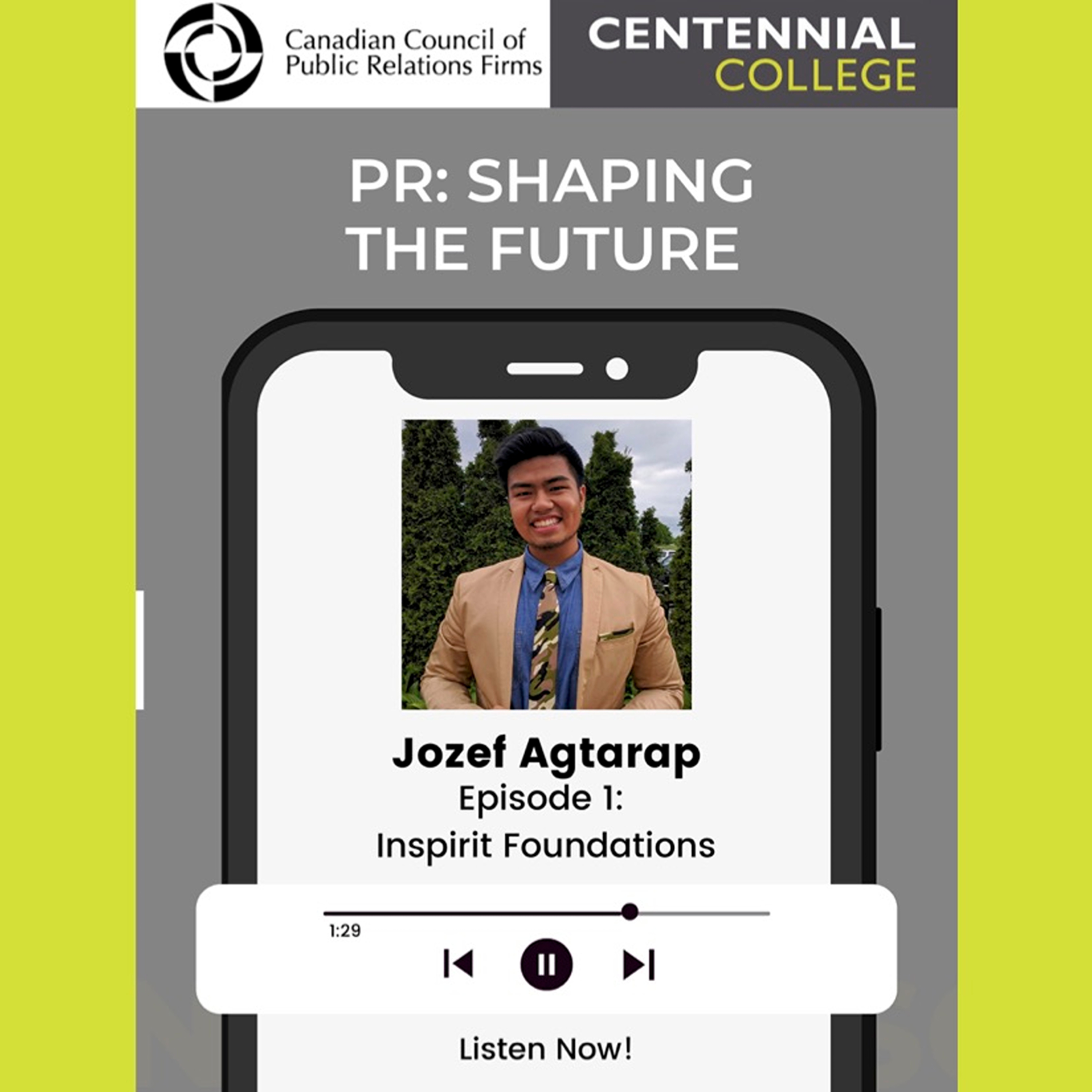 PR: Shaping the Future is a three-episode podcast series by postgraduate students in Centennial College’s Public Relations and Corporate Communications program, exploring diversity in the industry through interviews with BIPOC professionals in the PR industry. In this first episode, we interview Joseph Actra, of In Spirit Foundations, and discuss his work, his journey, his challenges and barriers, and the future of Public Relations.