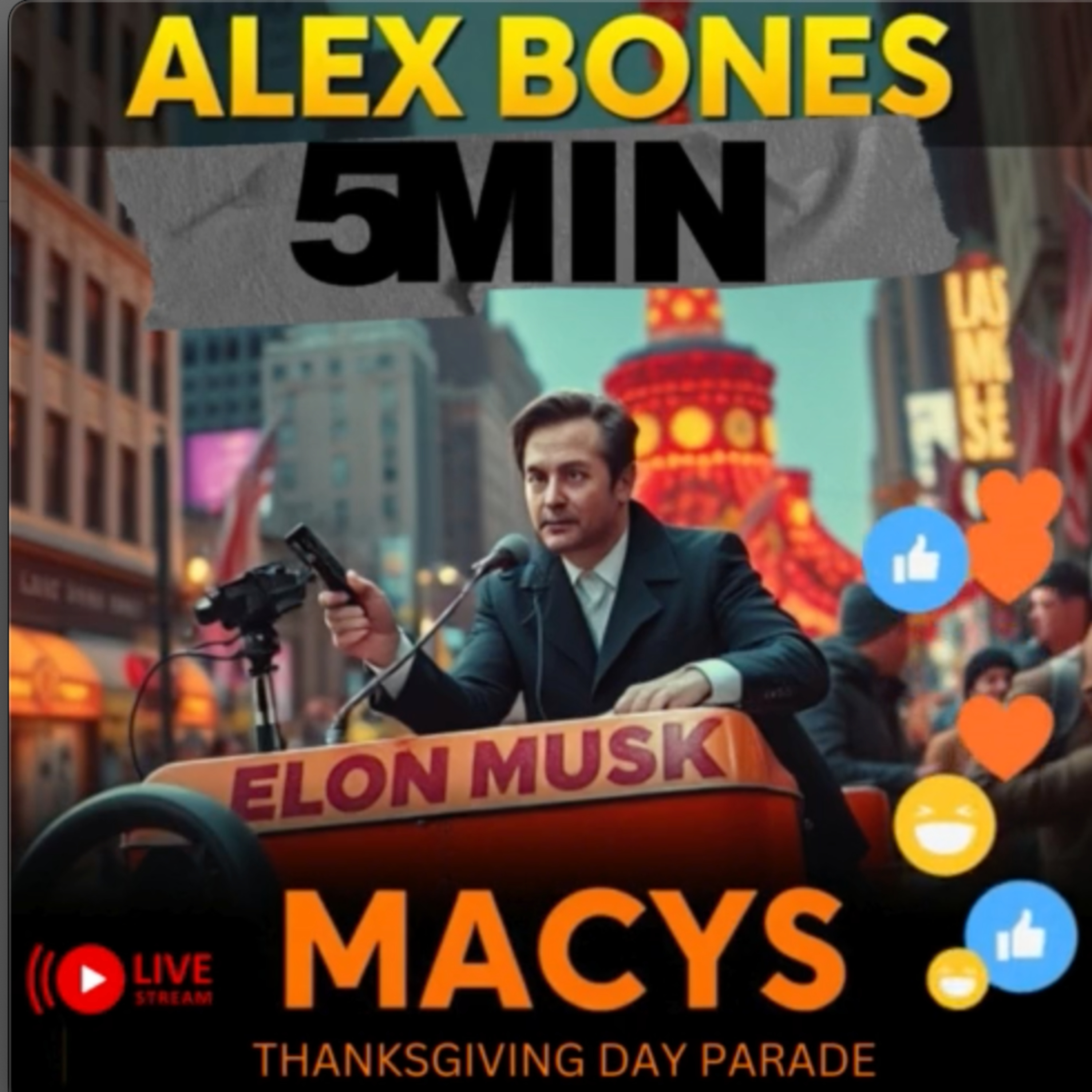 Alex Bones and Jimmy his producer are at the Macy's @Thanksgiving Day Parade, where they see the Elon Musk float, the Art the Clown Balloon and the #jakePaul float