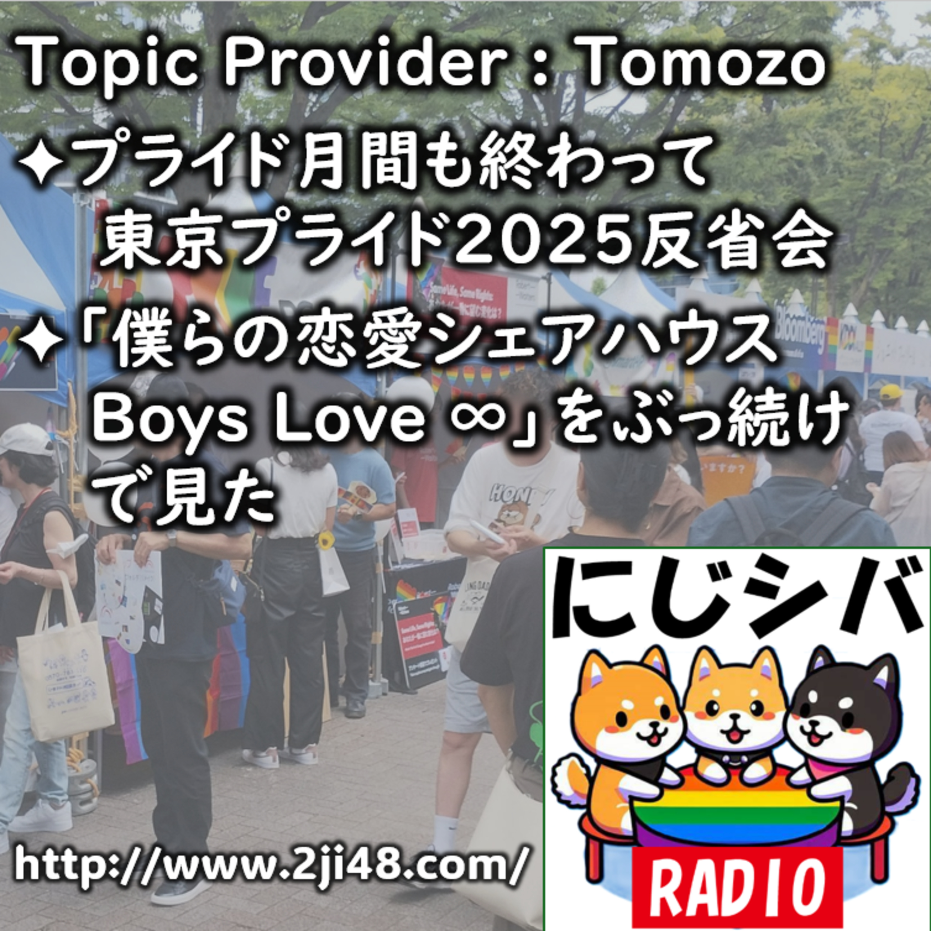 ともぞー話題提供回 / 東京プライド2025振り返り反省会 / 東京プライド2025の外資系スポンサー / プライド・パレード参加者のスポンサーに対する姿勢 / 東京プライドのブースで企業がやっていること / 渋谷~表参道の明治通り沿いに並んでパレードを応援するアライ企業 / 東京プライド2025は一般世間とのつながりが希薄になっているのでは? / パレード当日は過密で楽しめない問題 / 企業の看板がどうのではなく、個人としてアライになってほしい / 「僕らの恋愛シェアハウス Boys Love ∞」に見る日本と韓国のゲイ文化の違い / 韓国社会に関する先入観が崩れる経験 /