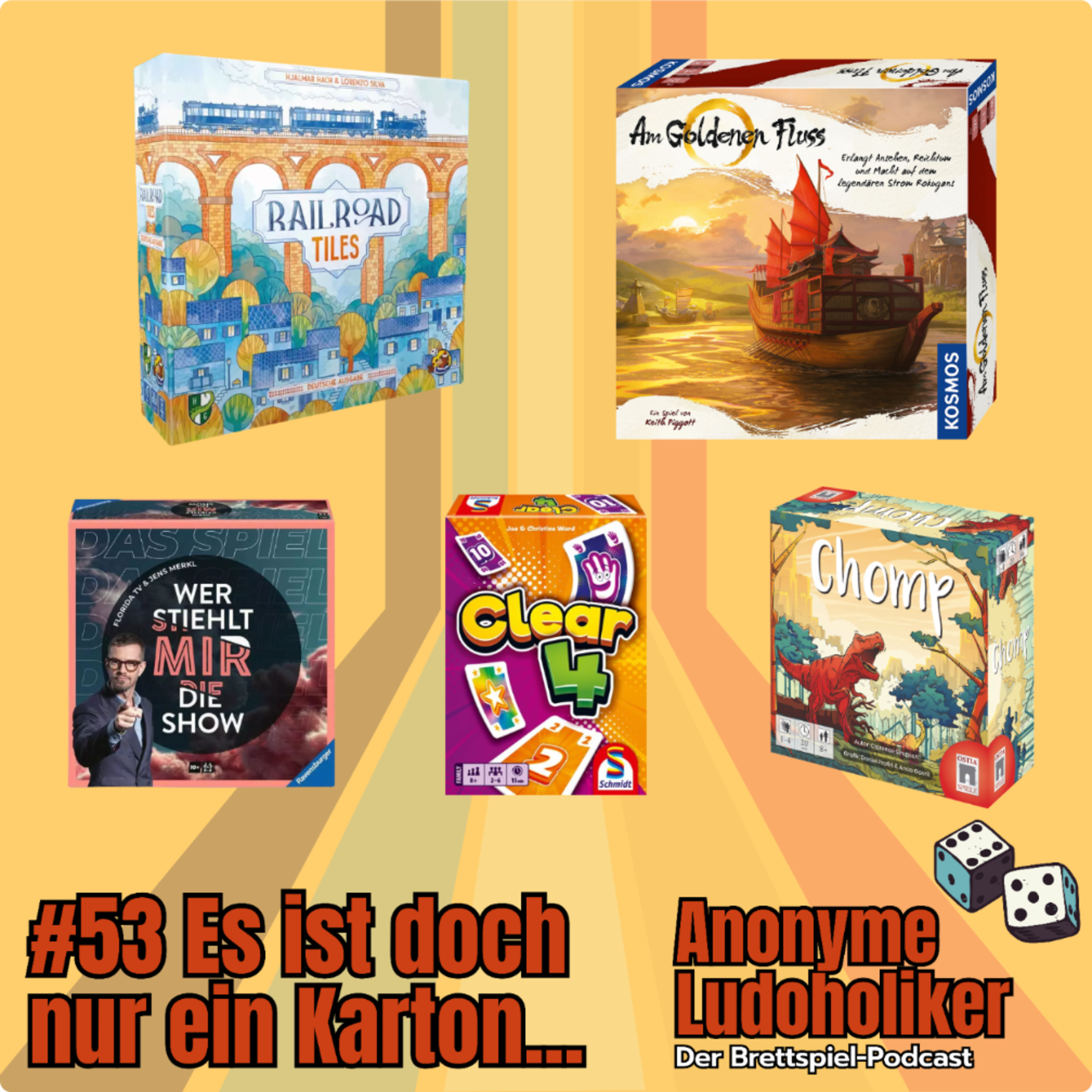 Wir klären, wie sich Wer stiehlt mir die Show? als Brettspiel schlägt, knabbern uns durch Chomp, kloppen Karten bei Clear 4, reisen Am goldenen Fluss entlang und bauen zum Abschluss noch Strecken in Railroad Tiles.