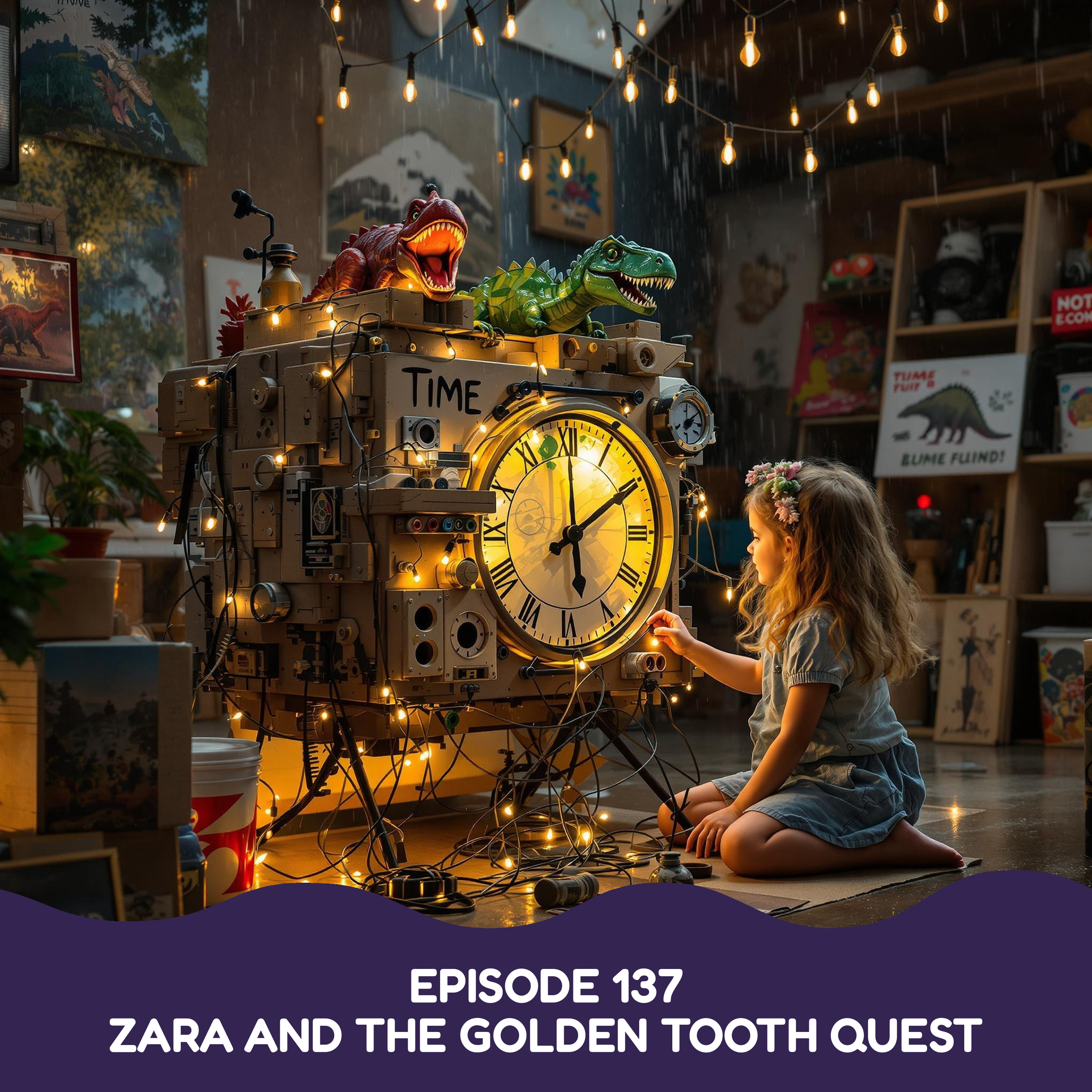 Join Zara, our dinosaur expert extraordinaire, as she transforms cardboard boxes, bicycle parts, and twinkling Christmas lights into a magnificent time machine that whisks her 65 million years into the past! Through towering prehistoric ferns and blooming flowers in colors without names, Zara meets gentle Triceratops families and playful baby Pterodactyls soaring overhead. But it's her friendship with Pip, a feathered dinosaur with bright purple-green plumage, that leads her to the mysterious golden tooth and a choice that will test her heart.