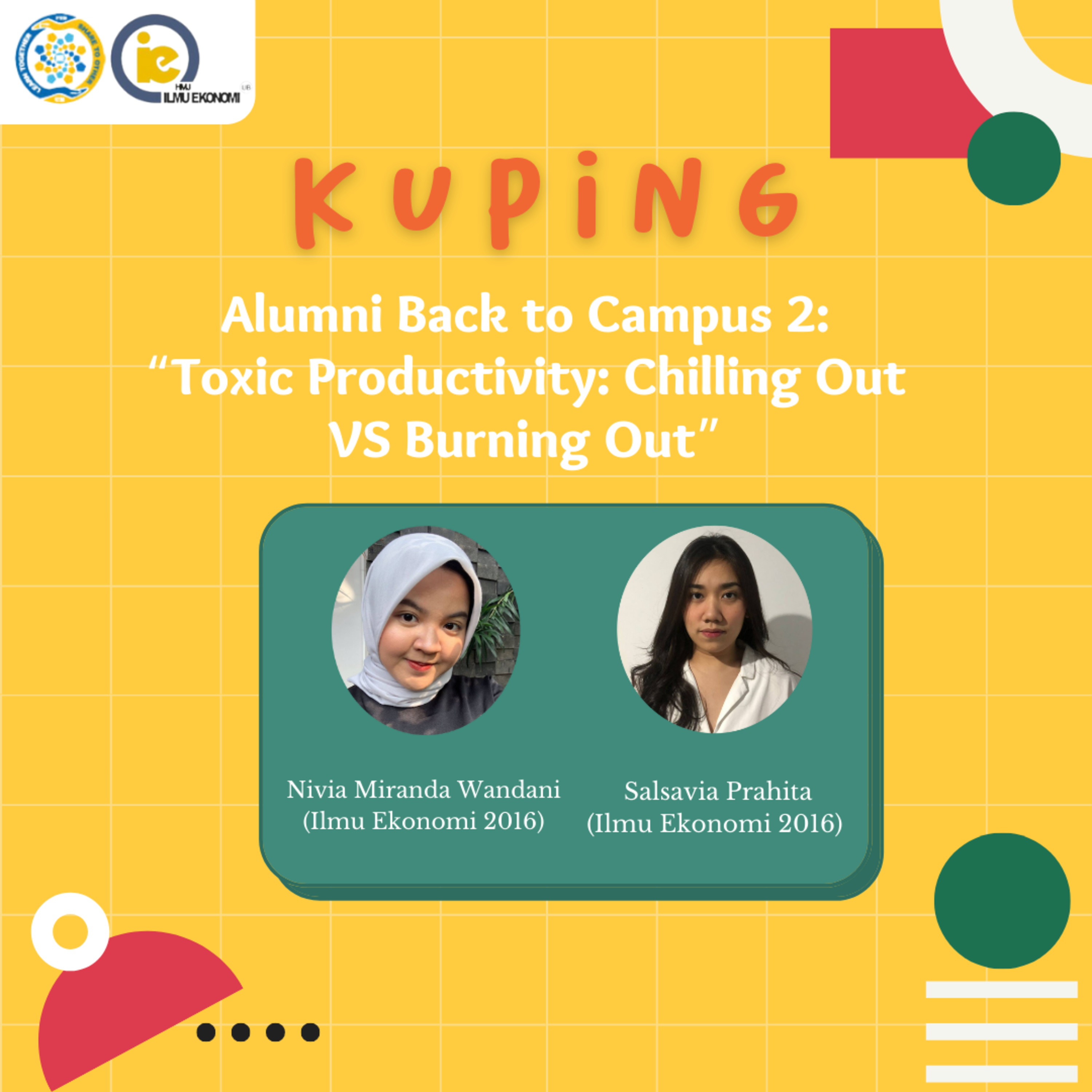 Alumni Back to Campus is back again! With a new look and a new theme. Alumni back to campus has discusses the theme "Toxic Productivity: Chilling out vs Burning out" which is certainly very exciting and gave us a lot of new knowledge and our speaker will be attended by alumni of the 2016 batch together with @salsaviaprahita and @niviamrnd. So what are you waiting for, check our Official Account Spotify right now!
