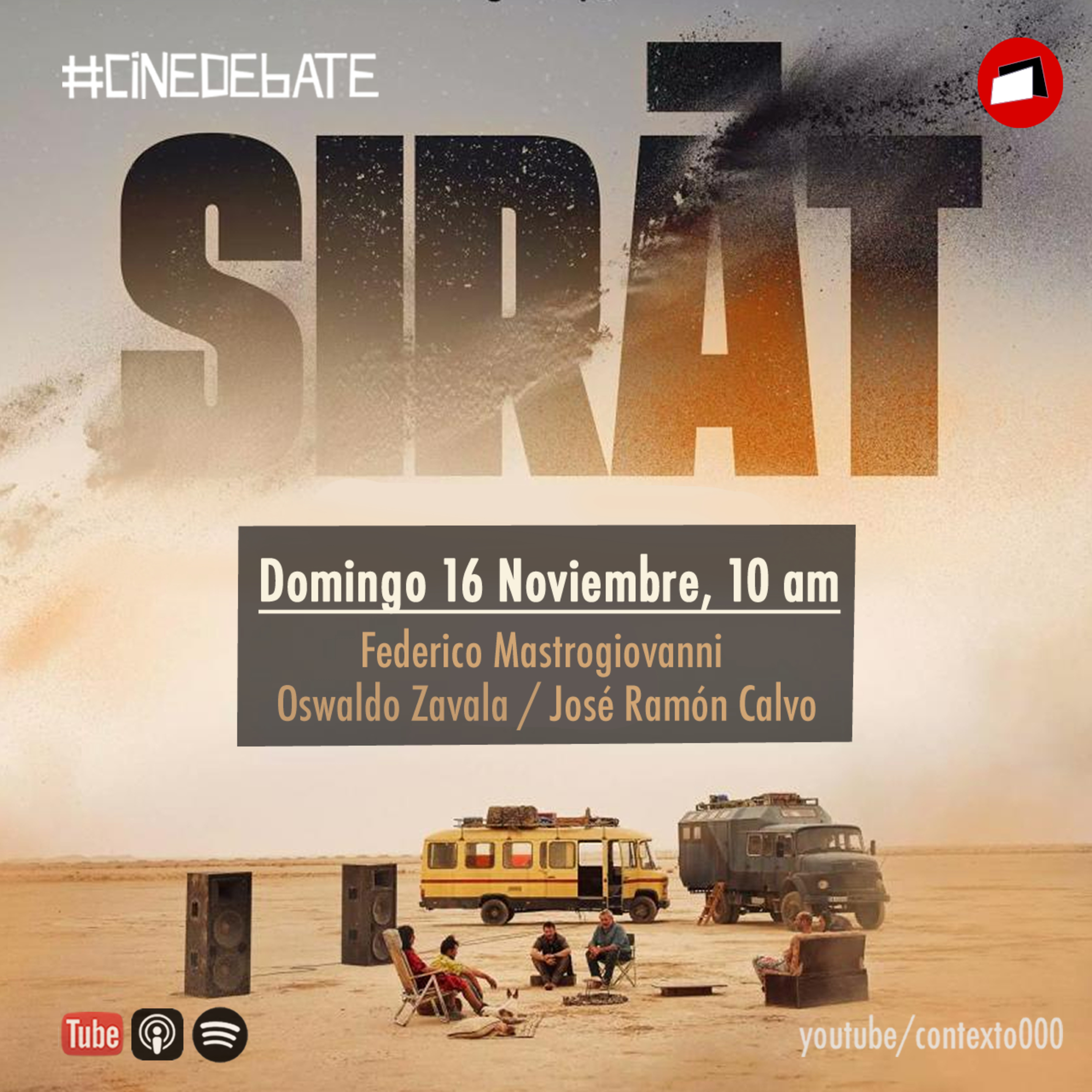 CineDebate en torno a #Sirat un road movie desértico en el que la búsqueda de una hija y hermana se transforma en un viaje interior abordando temas como la marginalidad, la libertad y los vínculos humanos y espirituales