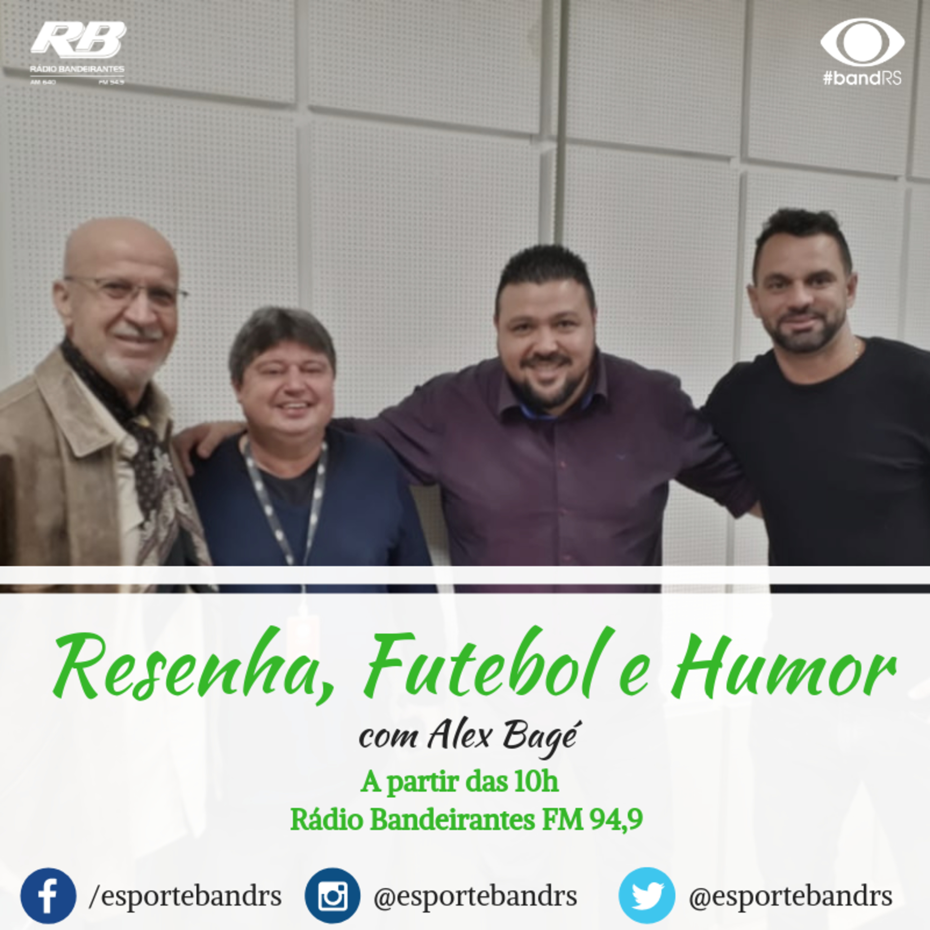 A hora do café ou do chimarrão de domingo nunca mais será a mesma" - Essa é a frase que define o que o programa busca trazer ao ouvinte. Comandado pelo jornalista Alex Bagé, o Resenha, Futebol e Humor chega pra fazer diferente! Com personalidades do esporte abordando histórias engraçadas e pouco conhecidas dos ouvintes, o Resenha chega para animar o dia de quem acompanha. Além disso, personalidades de fora do mundo esportivo participam, contribuindo, assim, para o lema do programa: Esporte com humor! Participam do programa: Magrão, Nobrinho e Cláudio Duarte