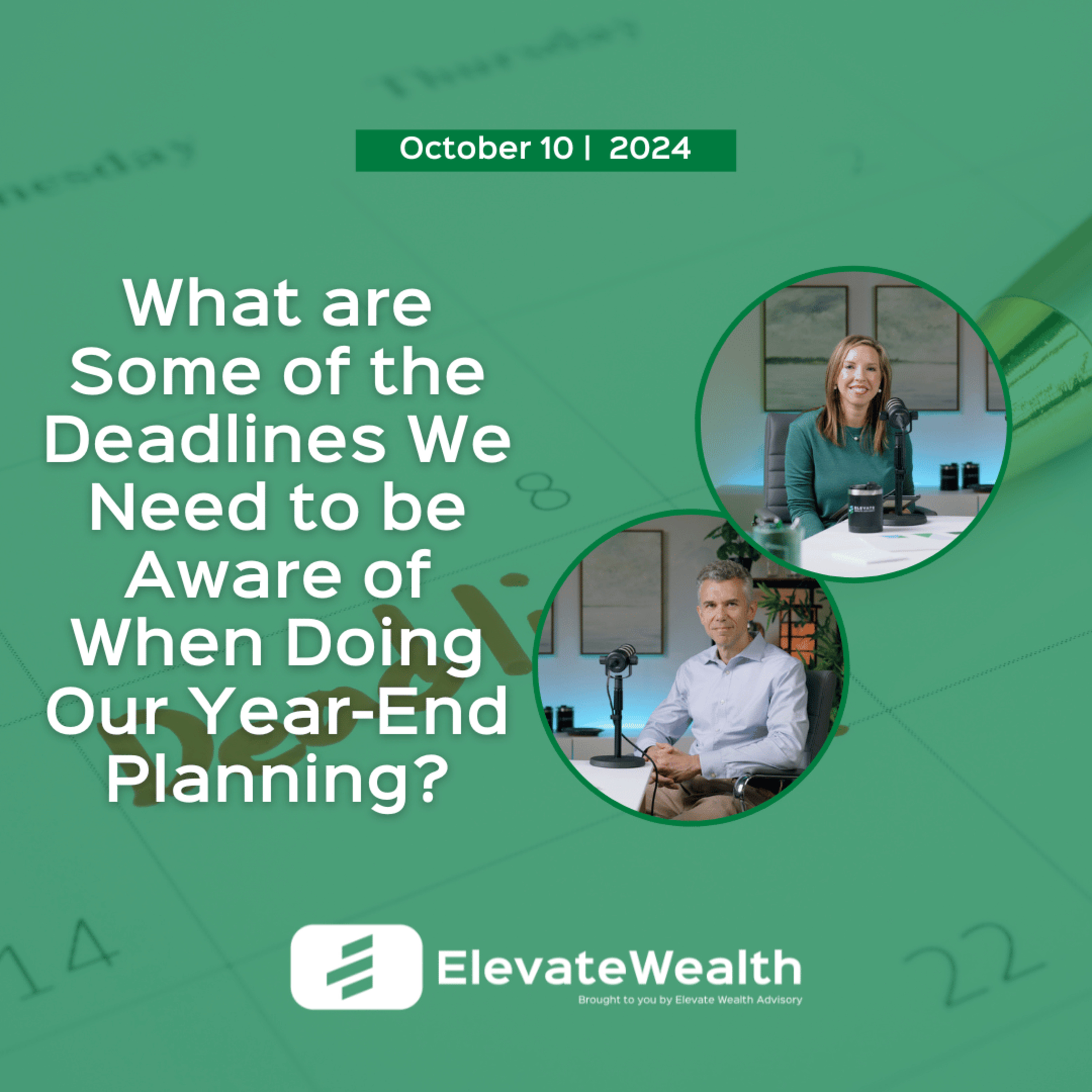 The end of the year is approaching. Make sure that you meet all your deadlines when it comes to your finances. Hey, there, I'm Deanne Rosso with Elevate Wealth, and I'm joined again by our Director of Investment Policy and Wealth Adviser Rob Fezekas. Hey, Rob. Hi, Deanne. Glad to have you, Rob. So what are some of the deadlines, Rob, that we need to remember here at year end? Most of these items do have a year-end deadline, so 12/31 is going to be the deadline that you want to keep in mind, and I'll give you a couple of examples. If you want to make a contribution to an employer-sponsored retirement plan, that has a 12/31 deadline. If you need to take a required minimum distribution from an IRA account, same thing, 12/31. And if you want to make a charitable contribution and then maybe deduct that off of your tax return, you need to make that contribution before December 31st. But some of the items actually have a later deadline that extends a few months into the next year, up to your personal tax filing deadline, and those would include things like making a contribution to a non-employer sponsored retirement account, like an IRA or a Roth account. Okay. Okay, So you know some of these deadlines are obvious to me, as far as which ones concern my situation, some of them are are not obvious, or I don't know about. So who should I consult with if I want to know what deadlines apply to me and maybe which ones don't? Sure. It's a lot to keep track of. First I'd recommend speaking with an expert. If you have a CPA or an adviser that you can speak to, they would be aware of these deadlines. You can also Google the information on the internet. Also, it's really a good idea to have just a good checklist, and there's one that we use in the office that we really like, and it has all the items on a single page, and it just really helps us to remember because there are a lot of things. Yeah, and I think we're going to post that checklist for you guys who are listening or watching to download. So take a look at that if you're interested. And it is a lot to keep up with, so if you have questions or if we can help at all feel free to visit us at elevate-wealth.com and click "Let's Talk." Thanks for joining me, Rob! Thank you, and we'll see you again next time.