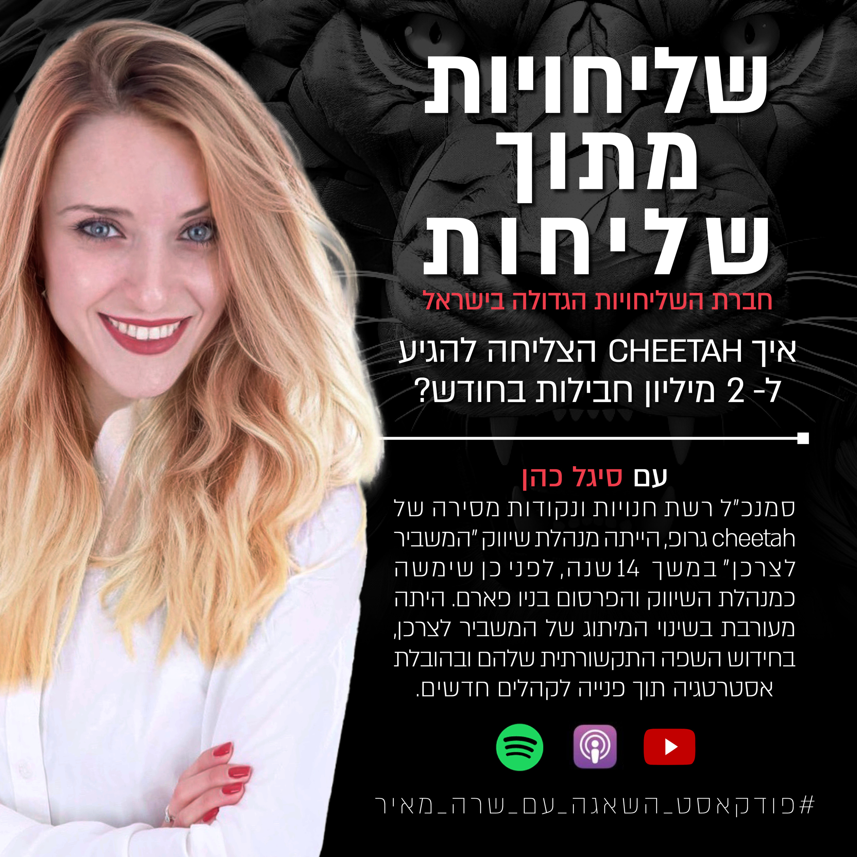 היום אני מראיינת את סיגל כהן, סמנכ״ל רשת חנויות ונקודות מסירה של cheetah גרופ, הייתה מנהלת שיווק "המשביר לצרכן" במשך 14 שנה, לפני כן שימשה כמנהלת השיווק והפרסום בניו פארם. היתה מעורבת בשינוי המיתוג של המשביר לצרכן, בחידוש השפה התקשורתית שלהם ובהובלת אסטרטגיה תוך פנייה לקהלים חדשים. בעלת מומחיות בתחום השיווק הדיגיטלי.